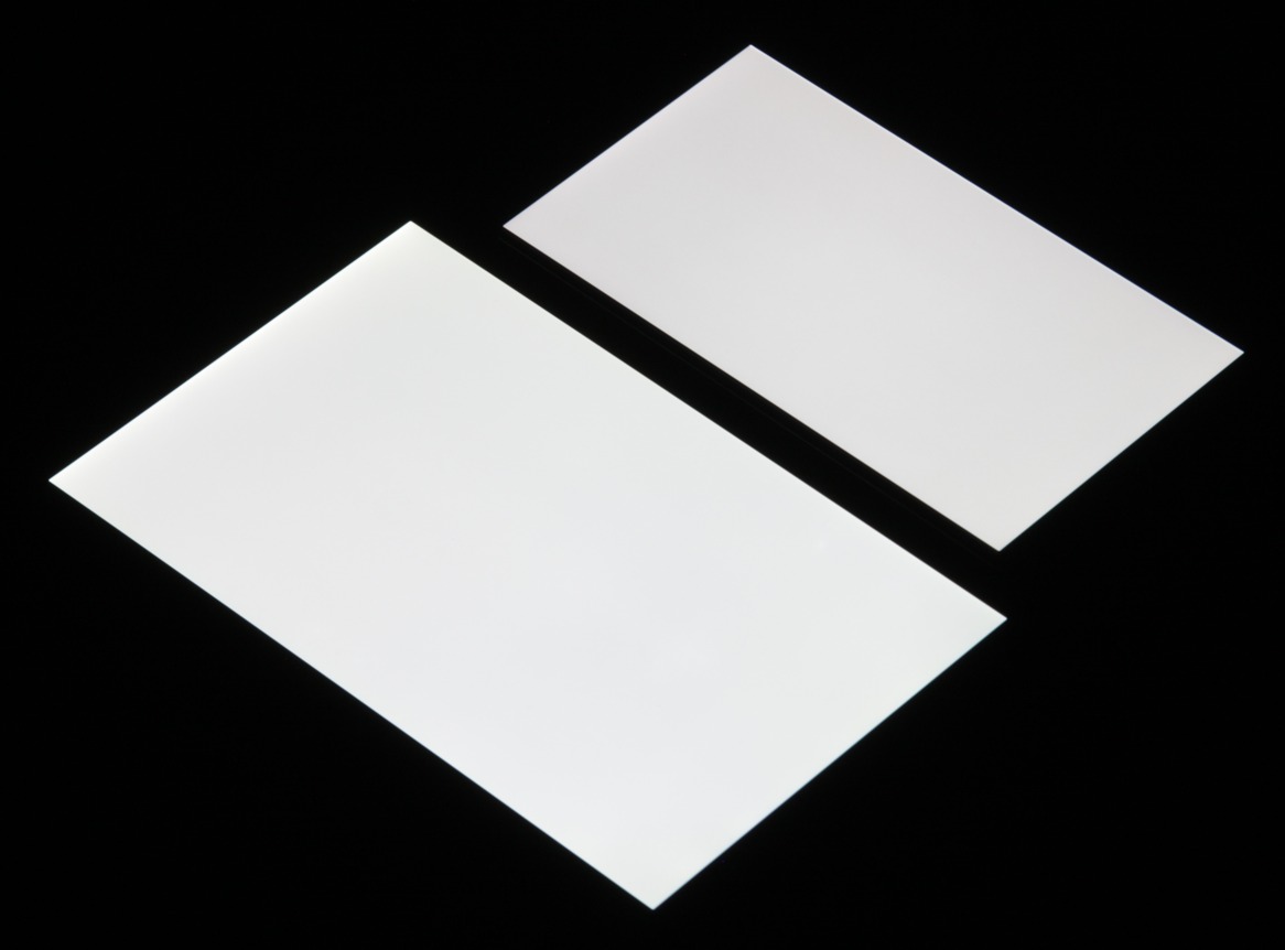 Лицевая поверхность экрана выполнена в виде стеклянной пластины с зеркально-гладкой поверхностью, устойчивой к появлению царапин. Судя по отражению объектов антибликовые свойства экрана лучше, чем у экрана Google Nexus 7 (2013) (далее просто Nexus 7). Для наглядности приведем фотографию, на которой в выключенных экранах отражается белая поверхность (слева — Nexus 7, справа — Honor 8 Pro, далее их можно различать по размеру):