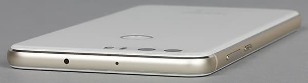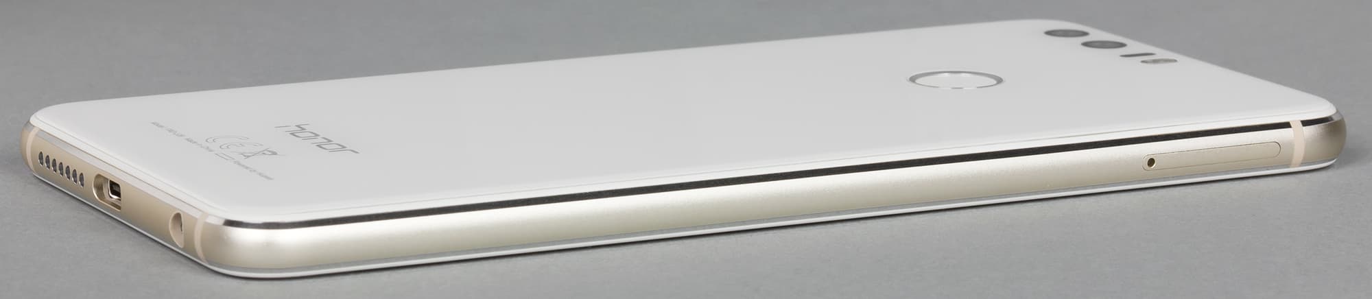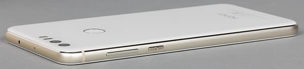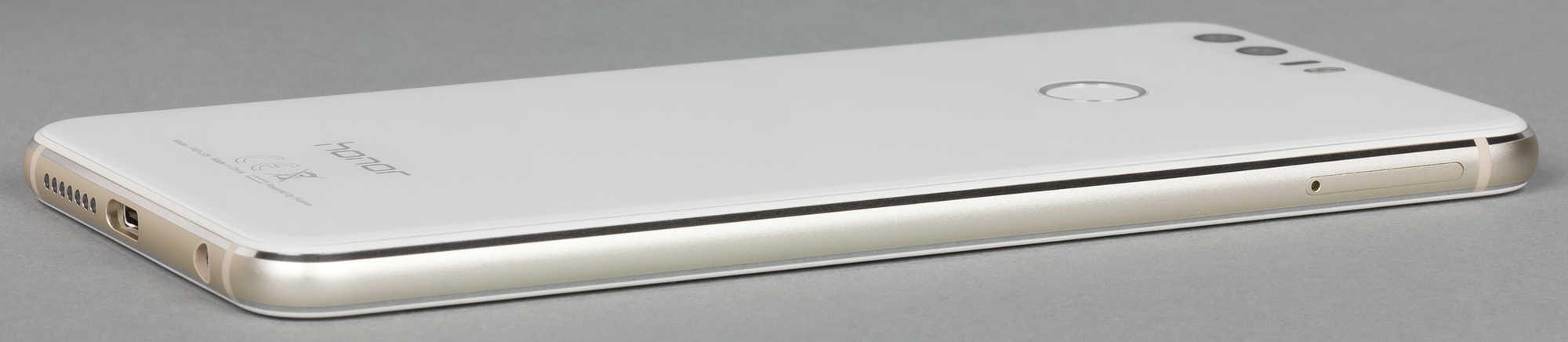 Поверхности корпуса совершенно не скользкие, аппарат надежно удерживается в пальцах. Не слишком крупные габариты и небольшая масса также этому способствуют. К сборке претензий нет, щелей, прогибов и скрипов нет, все детали подогнаны четко, неразборный корпус Honor 8 монолитен.