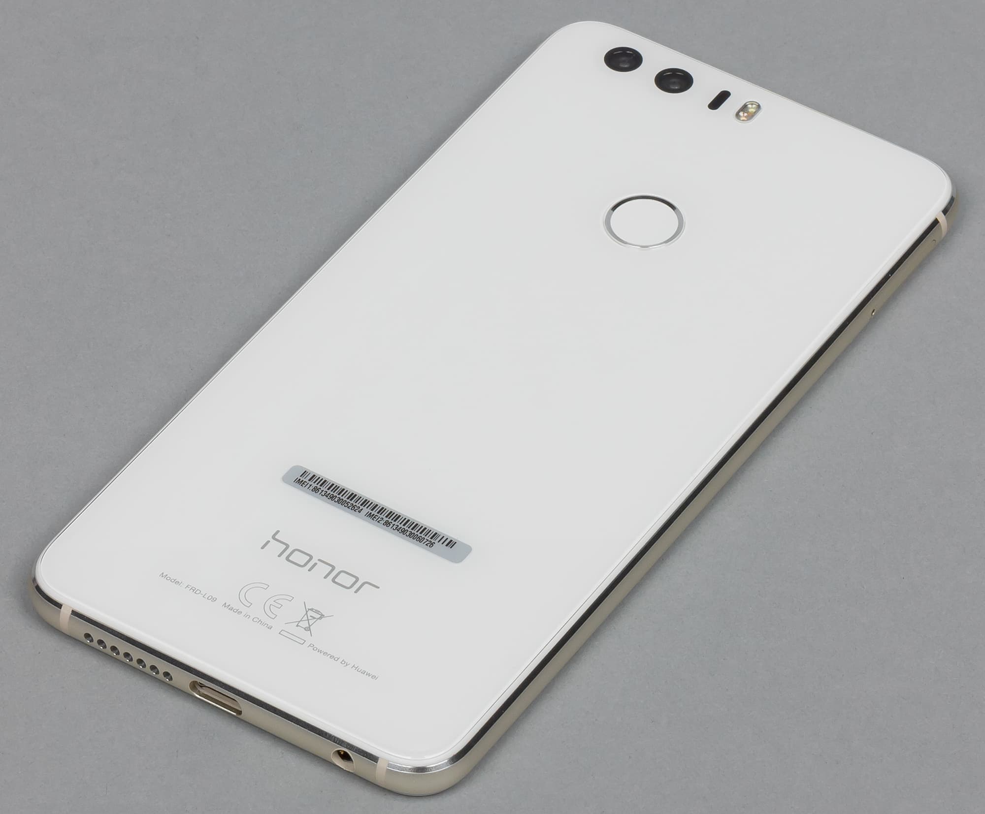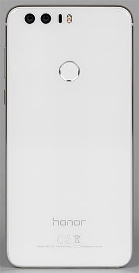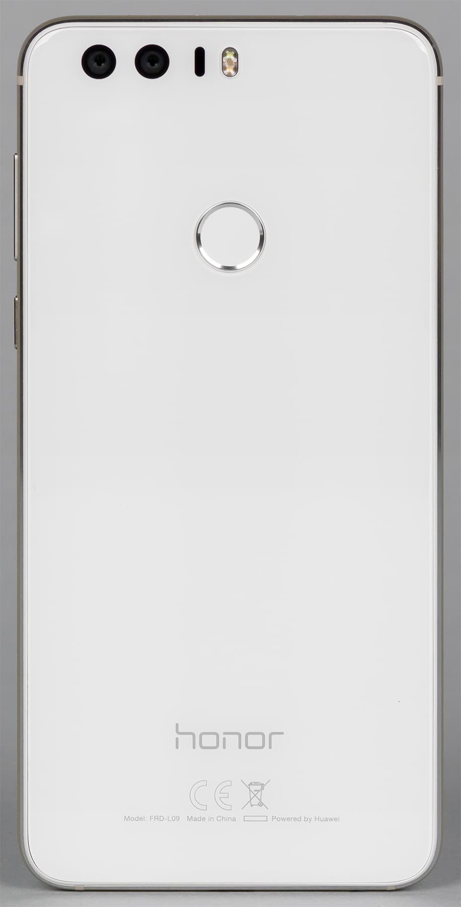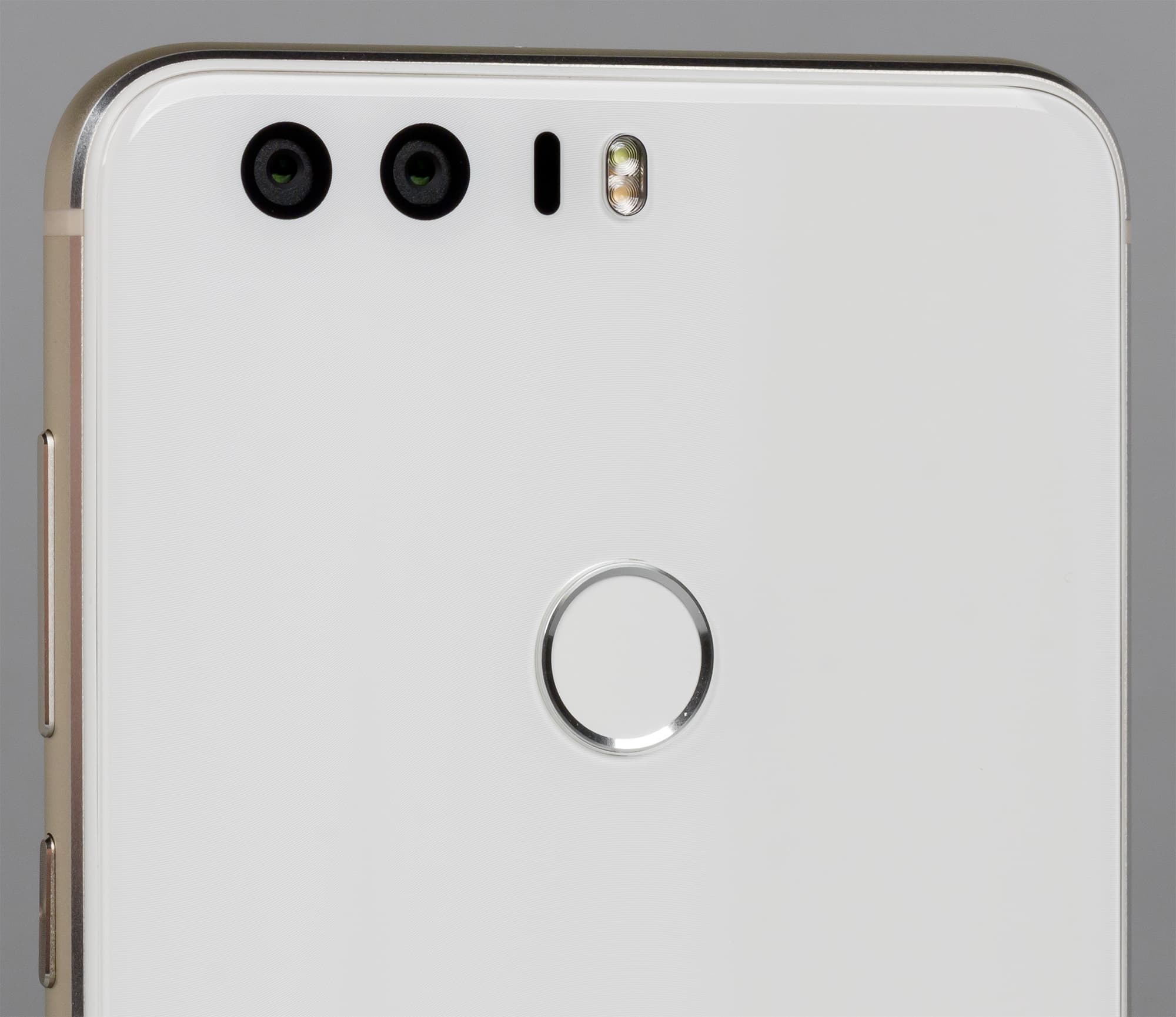 На тыльной стороне элементов больше, чем обычно. Помимо упомянутого дактилоскопического датчика с кнопкой, здесь также имеется два круглых глазка камеры, поскольку Honor 8, как и его родные братья из семейства Huawei P9, получил сдвоенную камеру. Рядом с камерами можно найти двойную светодиодную вспышку и окошко лазерного целеуказателя для автоматической фокусировки.