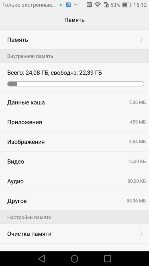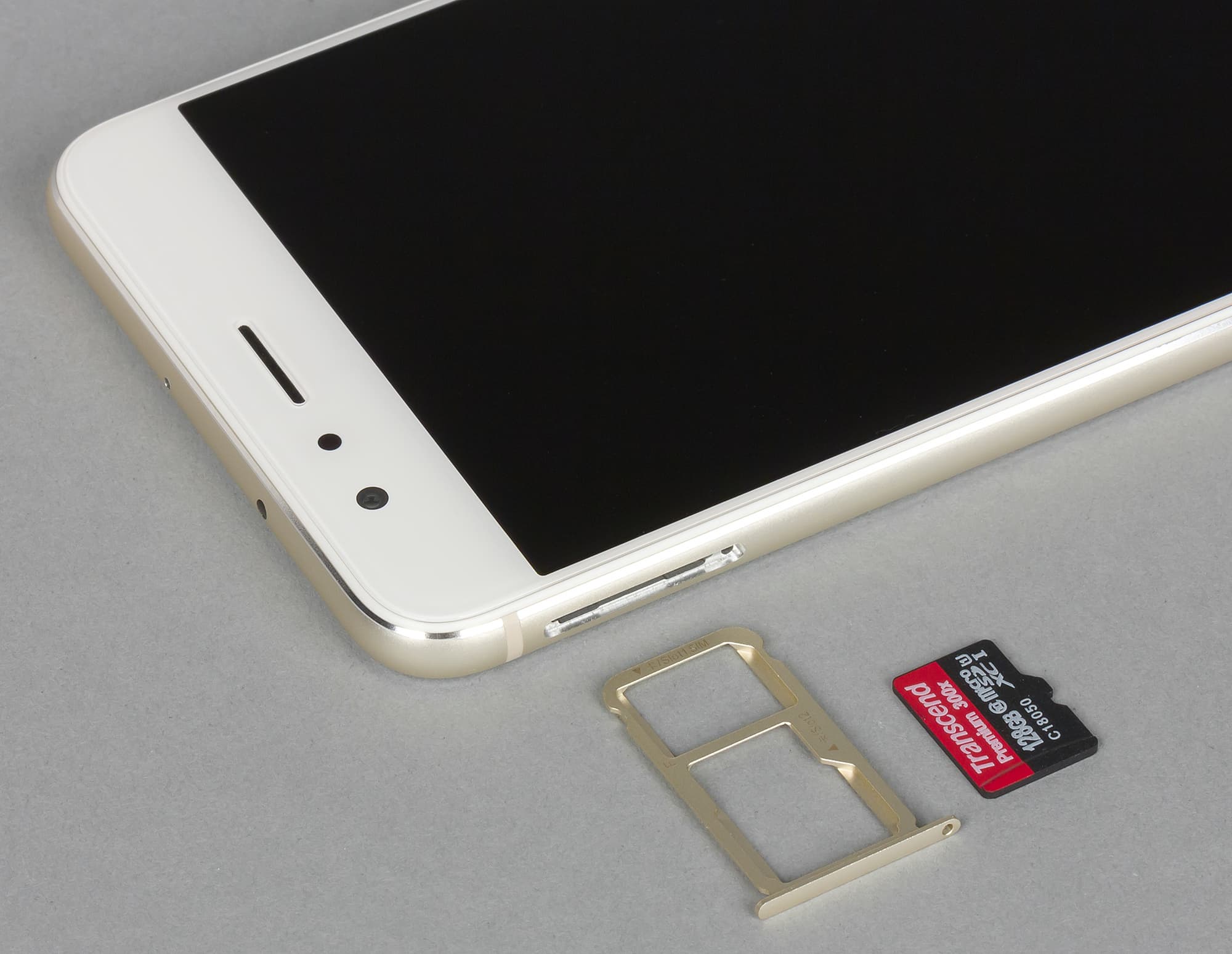 Объем оперативной памяти смартфона составляет 4 ГБ, объем встроенной флэш-памяти — 32 или 64 ГБ (пользователю из 32 ГБ остается не более 23 ГБ свободного пространства). Этот объем можно увеличить за счет карт microSD, но тогда придется изъять одну из SIM-карт. Также есть возможность подключения к порту USB внешних флэш-накопителей в режиме OTG. Карты microSD официально поддерживаются емкостью до 128 ГБ, на практике наша проверочная карта Transcend Premium microSDXC UHS-1 объемом 128 ГБ уверенно распозналась устройством.