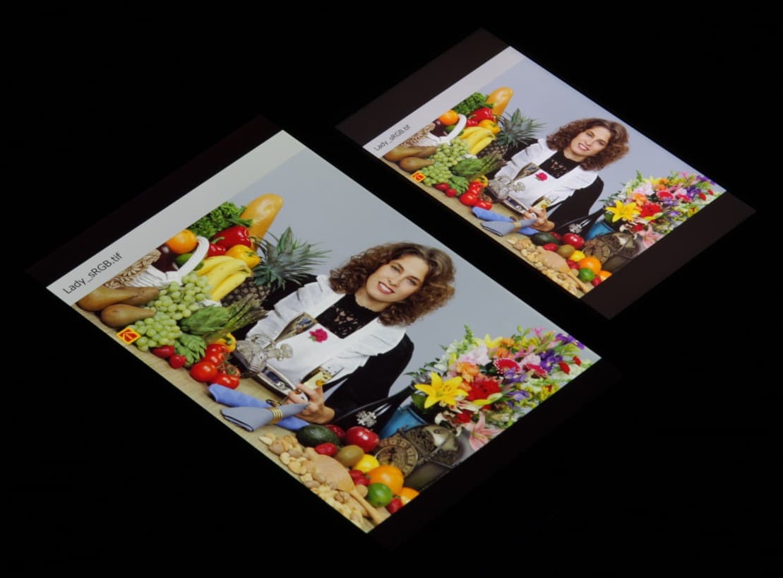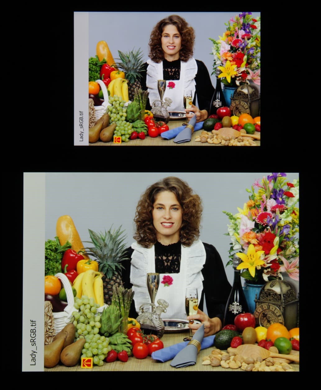 Они нетипичные, но их мы уже видели в случае, например, Sony Xperia Z2 и других мобильных устройств. Sony указывает, что в этих экранах используются светодиоды с синим излучателем и зеленым и красным люминофором (обычно — синий излучатель и желтый люминофор), что в сочетании со специальными светофильтрами матрицы и позволяет получить широкий цветовой охват. Да, и в красном люминофоре, видимо, используются так называемые квантовые точки. Для потребительского устройства широкий цветовой охват является никак не достоинством, а существенным недостатком, так как в итоге цвета изображений — рисунков, фотографий и фильмов, — ориентированных на пространство sRGB (а таких подавляющее большинство), имеют неестественную насыщенность. Особенно это заметно на узнаваемых оттенках, например на оттенках кожи. Результат приведен на фотографии выше.