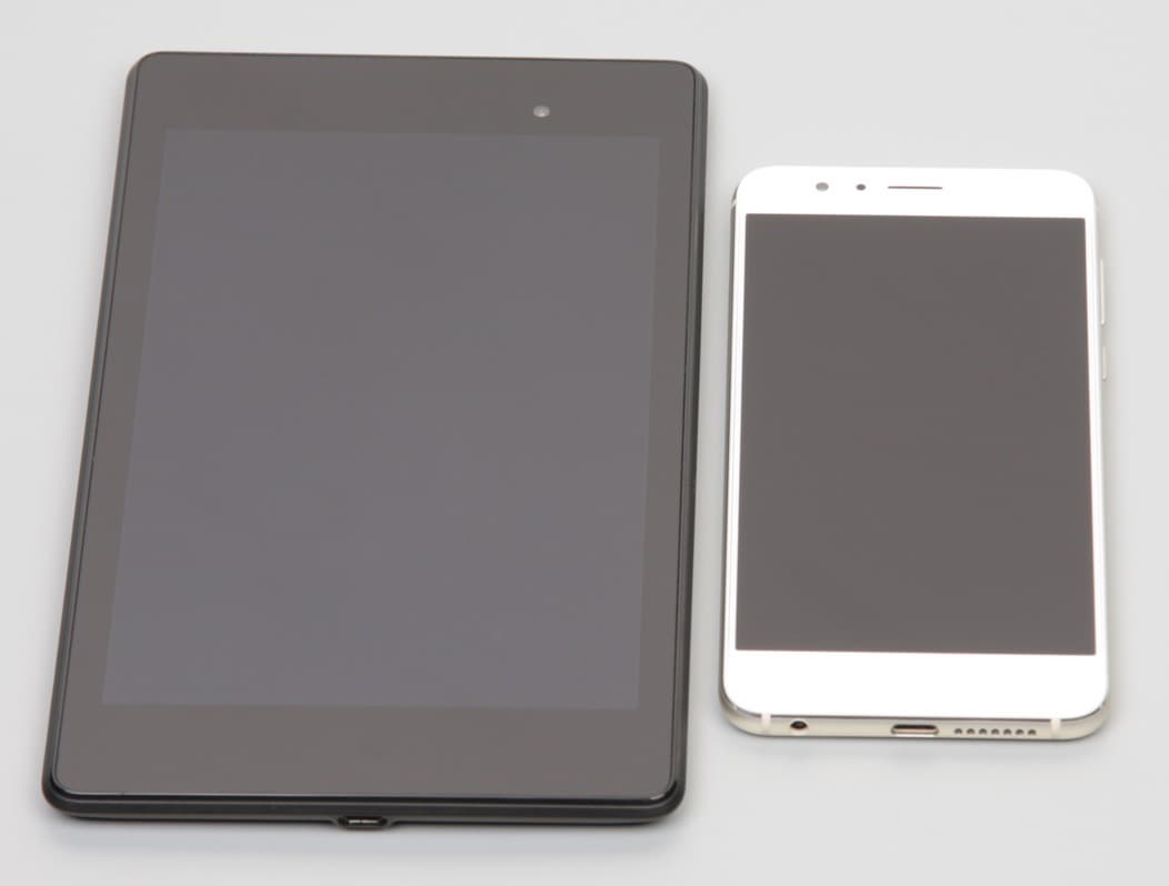 Лицевая поверхность экрана выполнена в виде стеклянной пластины с зеркально-гладкой поверхностью, устойчивой к появлению царапин. Судя по отражению объектов антибликовые свойства экрана лучше, чем у экрана Google Nexus 7 (2013) (далее просто Nexus 7). Для наглядности приведем фотографию, на которой в выключенных экранах отражается белая поверхность (слева — Nexus 7, справа — Honor 8, далее их можно различать по размеру):