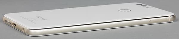 Смартфон получил две прозрачные стеклянные 2.5D-панели Gorilla Glass со сглаженными краями на обе стороны корпуса, а по боковому периметру пущен металлический сильно закругленный ободок. Таким образом, ни прямых углов, ни острых граней тут не найти, корпус Honor 8 абсолютно обтекаем и весьма приятен для удержания в руке.
