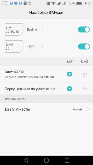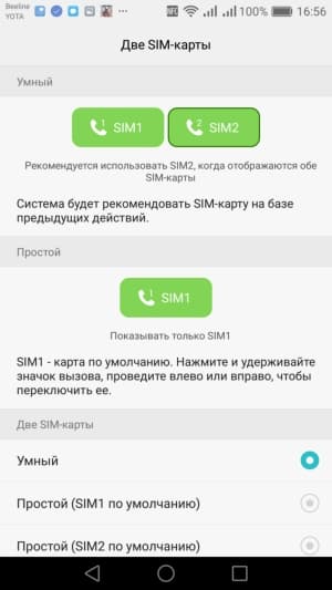 Любую из SIM-карт можно назначить основной для организации голосовых звонков, передачи данных и отправки SMS-сообщений; при наборе номера также можно выбрать желаемую карту соответствующими кнопками.