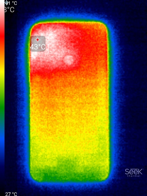 Нагрев больше локализован в верхней правой части аппарата, что, видимо, соответствует расположению микросхемы SoC. По данным теплокамеры, максимальный нагрев составил 43 градуса (при температуре окружающего воздуха в 24 градуса), это несколько выше среднего значения в данном тесте для современных смартфонов.