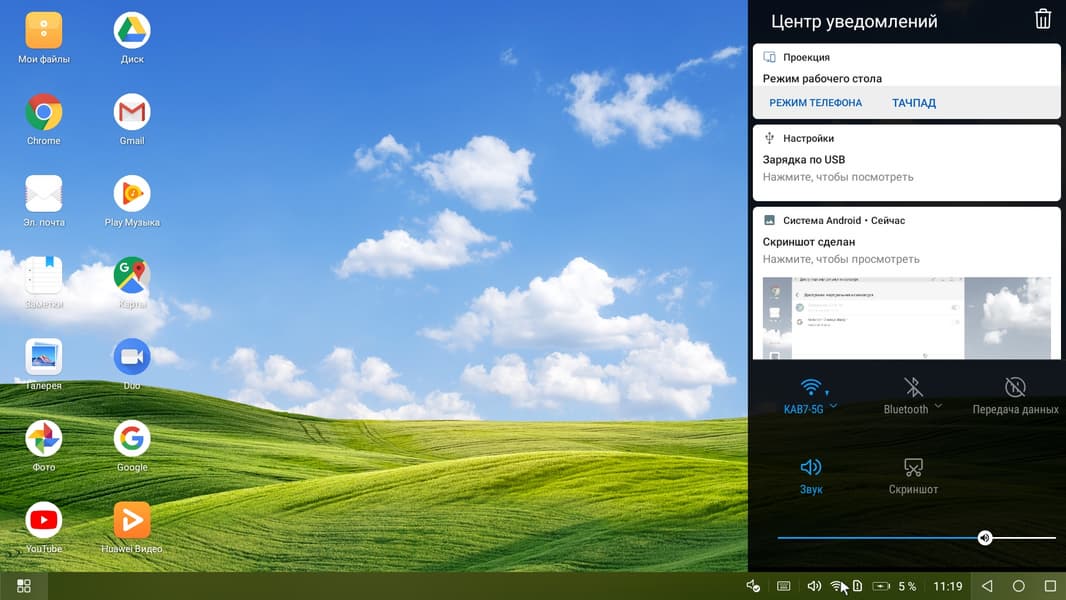 Во втором случае при портретной ориентации экрана смартфона картинка на мониторе Full HD выводится вписанной по высоте и с широкими черными полями по бокам, а при ландшафтной — вписанной по ширине с узкими черными полями сверху и снизу. Вывода точка в точку в обоих вариантах нет. В режиме альтернативного рабочего стола на монитор выводится совершенно другой основной экран, а экран смартфона может использоваться в качестве сенсорной панели координатного ввода. Вот пример такого рабочего стола: