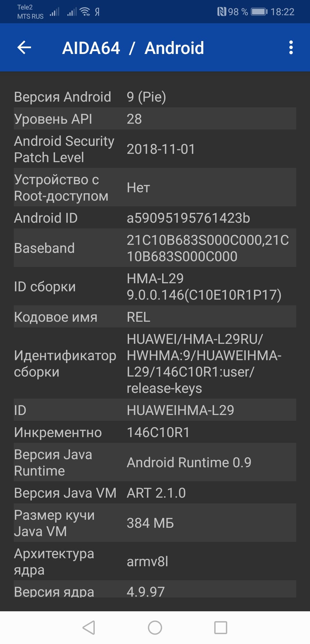 Основные характеристики Huawei Mate 20 (модель HMA-L29)