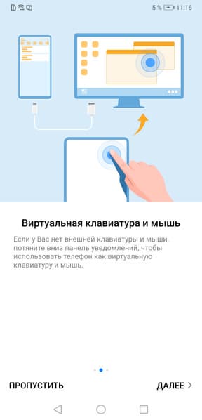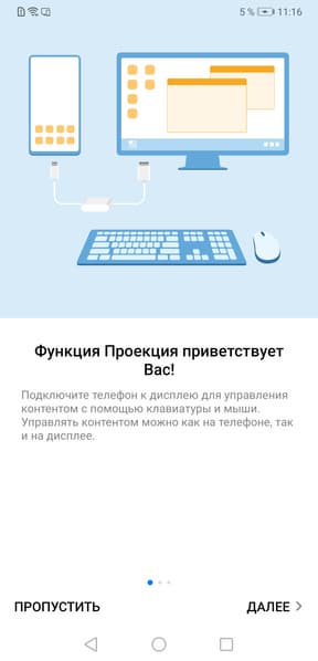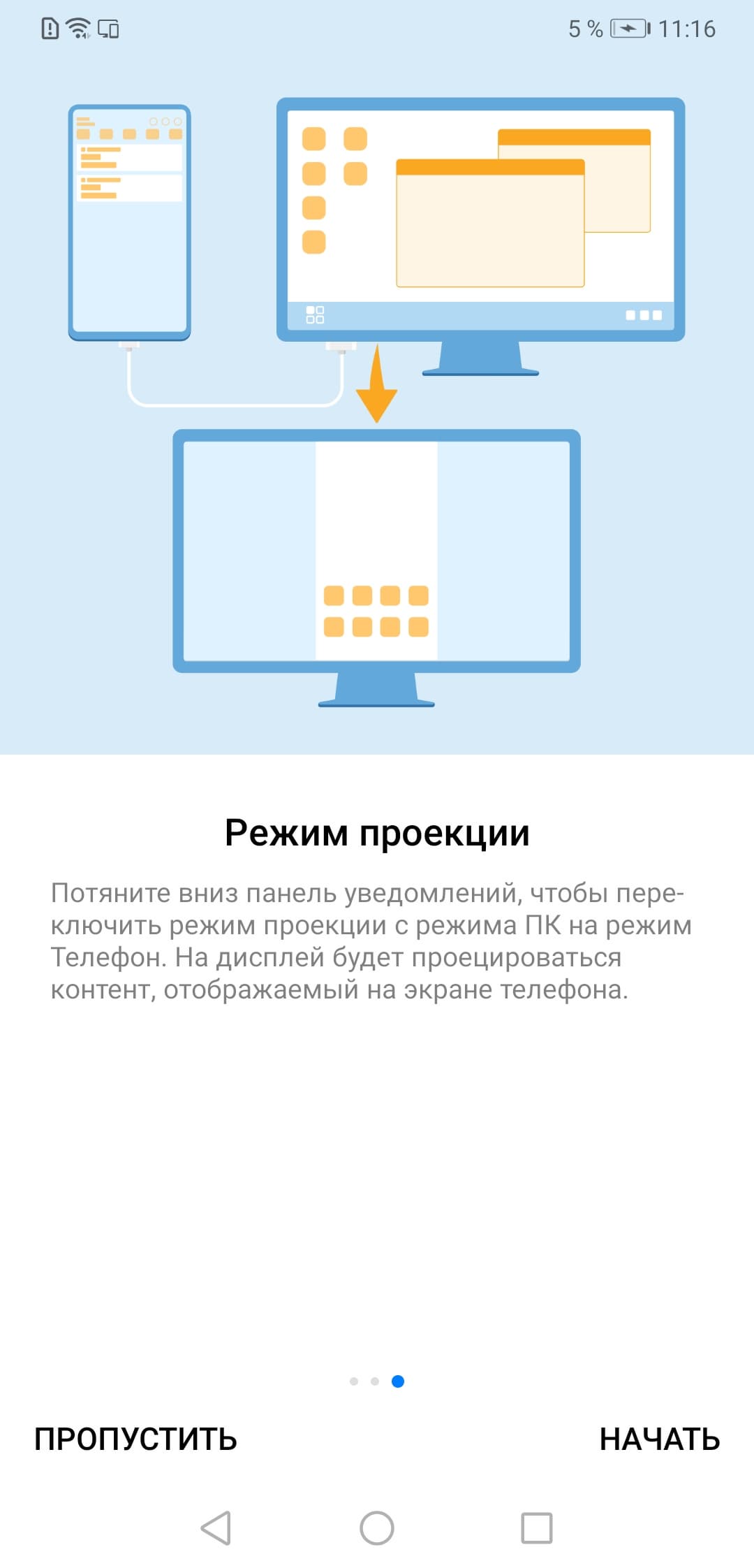 Данный аппарат поддерживает DisplayPort Alt Mode для USB Type-C — вывод изображения и звука на внешнее устройство при подключении к порту USB. Работу в таком режиме мы опробовали совместно с тремя адаптерами (USB Type-C → HDMI компании Choetech, Tronsmart CTHA1 и Aten UH3234). При подключении к нашему монитору вывод видео осуществляется в режиме 1080p при 75 Гц кадровой частоты. Режимов работы два: вывод альтернативного рабочего стола (режим ПК) или простое копирование экрана смартфона (режим проекции).