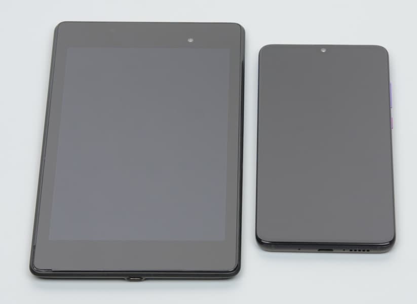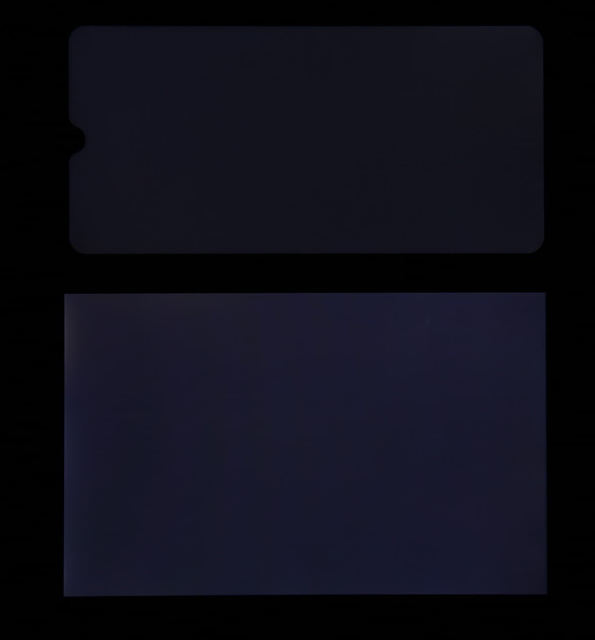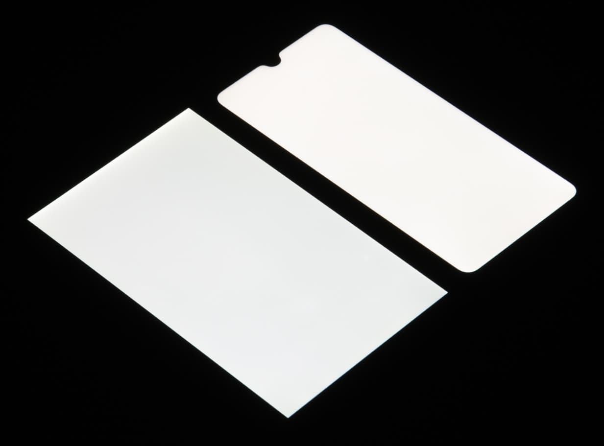 Лицевая поверхность экрана выполнена в виде стеклянной пластины с зеркально-гладкой поверхностью, устойчивой к появлению царапин. Судя по отражению объектов, антибликовые свойства экрана лучше, чем у экрана Google Nexus 7 (2013) (далее просто Nexus 7). Для наглядности приведем фотографию, на которой в выключенных экранах отражается белая поверхность (слева — Nexus 7, справа — Huawei Mate 20, далее их можно различать по размеру):
