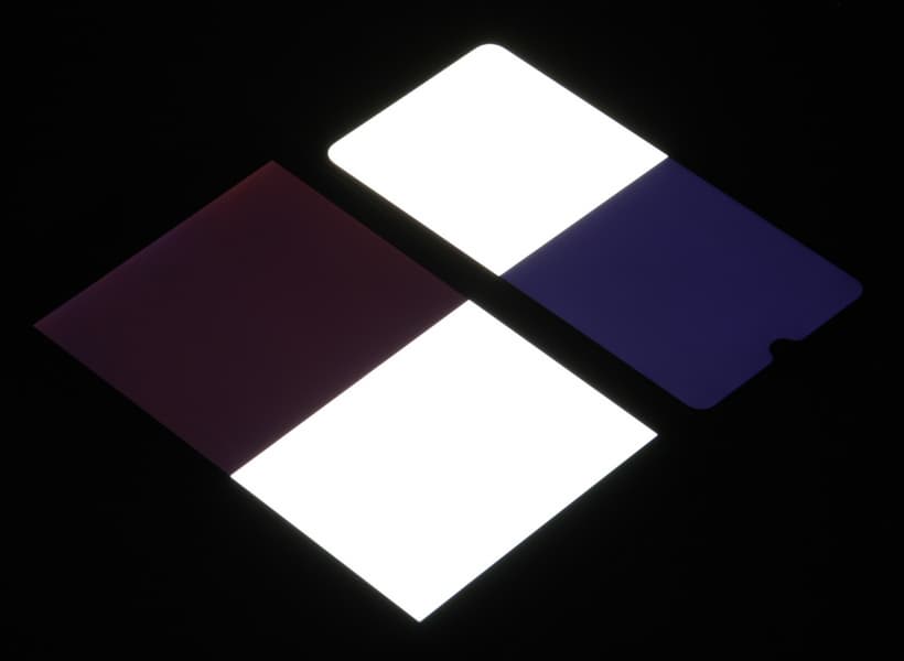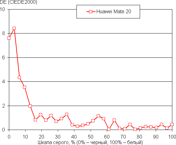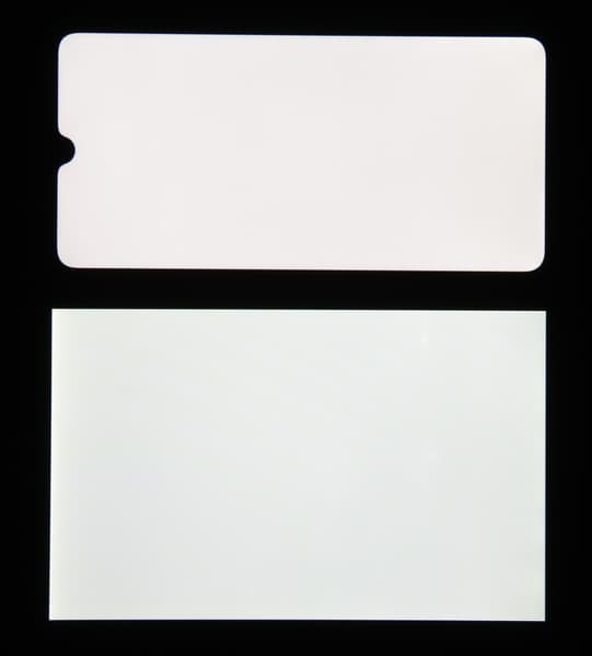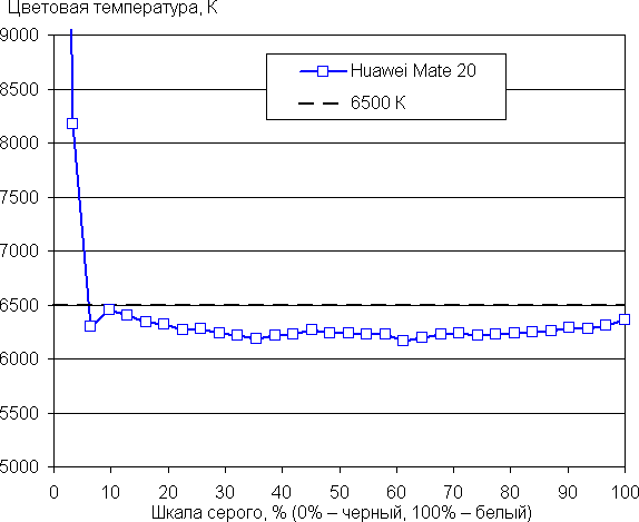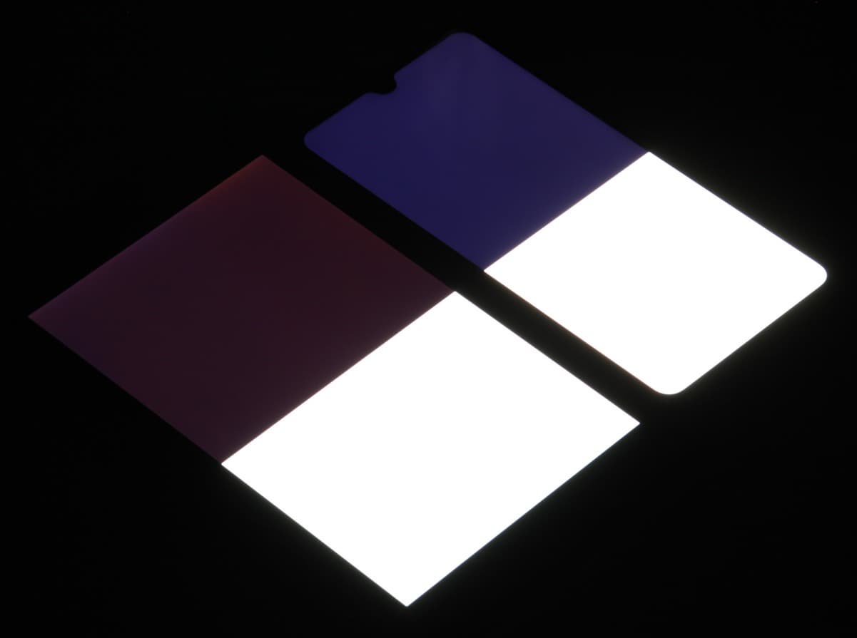 Отметим хорошую равномерность яркости и цветового тона белого поля. Напомним, что фотография не может служить надежным источником сведений о качестве цветопередачи и приводится только для условной наглядной иллюстрации. В частности, выраженный красноватый оттенок белого и серого полей, присутствующий на фотографиях экрана Huawei Mate 20, при перпендикулярном взгляде визуально отсутствует, что подтверждается аппаратными тестами с помощью спектрофотометра. Причина в том, что спектральная чувствительность матрицы фотоаппарата неточно совпадает с этой характеристикой человеческого зрения.