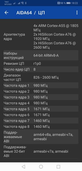 - SoC Huawei Kirin 980, 8 ядер: 2×Cortex-A76 @2,6 ГГц, 2×Cortex-A76 @1,9 ГГц, 4×Cortex-A55 @1,8 ГГц