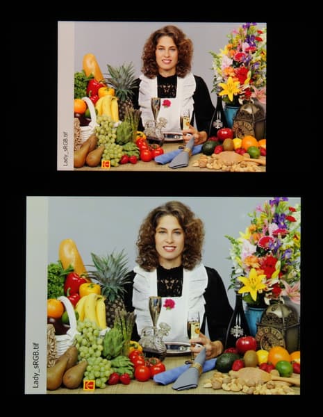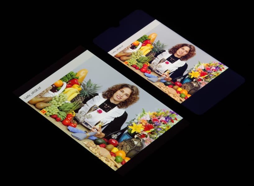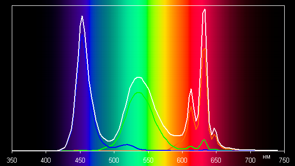 Спектры компонент хорошо разделены, что и обуславливает широкий цветовой охват. Для потребительского устройства широкий цветовой охват является никак не достоинством, а недостатком, поскольку в итоге цвета изображений — рисунков, фотографий и фильмов, — ориентированных на пространство sRGB (а таких подавляющее большинство), имеют неестественную насыщенность. Особенно это заметно на узнаваемых оттенках, например на оттенках кожи. Результат приведен на фотографии выше.