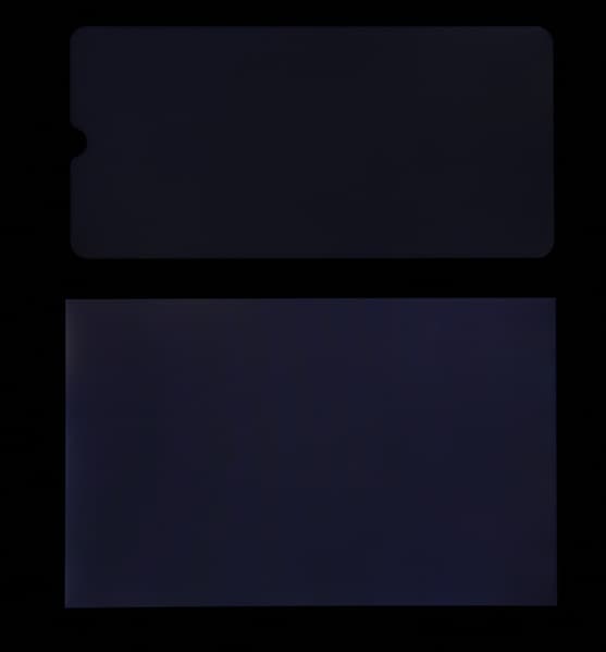 Яркость под углом у экранов уменьшилась (как минимум в 5 раз, исходя из разницы в выдержке), но у Huawei Mate 20 экран все же немного светлее. Черное поле при отклонении по диагонали высветляется в средней степени (у Nexus 7 оно все же темнее) и приобретает фиолетовый оттенок. Фотографии ниже это демонстрируют (яркость белых участков в перпендикулярном плоскости экранов направлении одинаковая!):