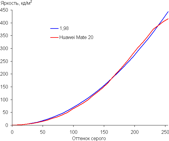 Контрастность (примерно в центре экрана) высокая — порядка 1300:1. Время отклика при переходе черный-белый-черный равно 22 мс (10 мс вкл. + 12 мс выкл.). Переход между полутонами серого 25% и 75% (по численному значению цвета) и обратно в сумме занимает 37 мс. Построенная по 32 точкам с равным интервалом по численному значению оттенка серого гамма-кривая не выявила завала ни в светах, ни в тенях. Показатель аппроксимирующей степенной функции равен 1,98, что ниже стандартного значения 2,2. При этом реальная гамма-кривая заметно отклоняется от степенной зависимости: