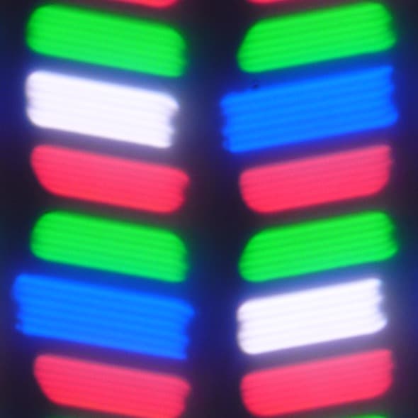 Как видно на микрофотографии выше, на которой представлен фрагмент из четырех пикселей, два синих субпикселя заменены на белые. Такое решение позволяет увеличить яркость белого поля без увеличения затрат на подсветку. Конечно, присутствуют и побочные эффекты: яркость цветного изображения при этом может быть непропорционально ниже яркости белых участков, к тому же мелкий текст, тонкие линии и т. д. выглядят более неровными, чем в случае обычного сочетания субпикселей и такого же разрешения. В то же время, снижение цветовой четкости по синему цвету должно минимально сказываться на качестве изображения, так как по этому цвету зрение человека имеет самое низкое разрешение.