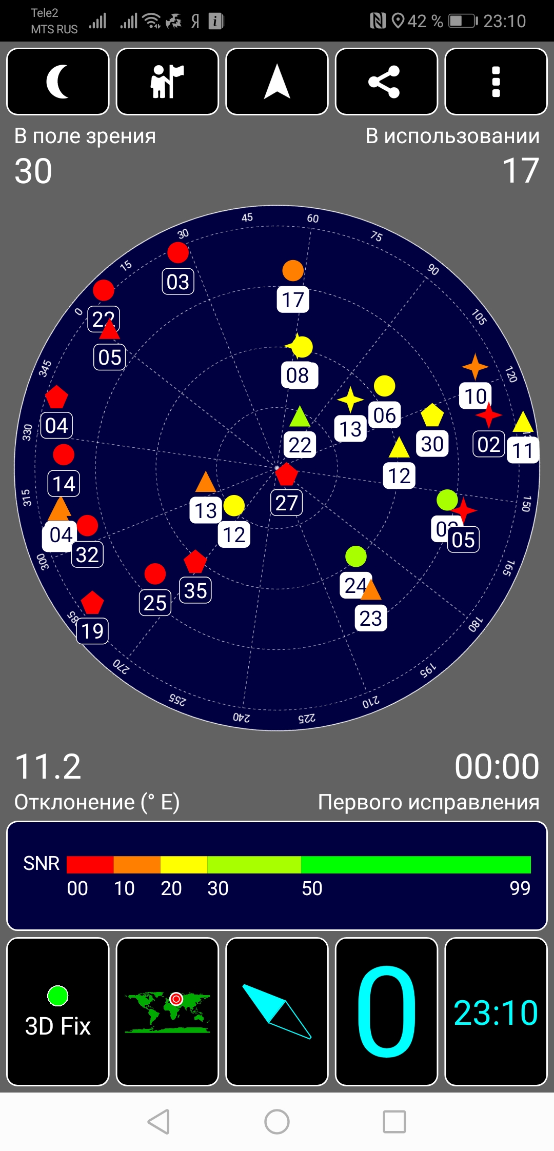 Навигационный модуль работает и с GPS (двухчастотный, с A-GPS), и с отечественной Глонасс, и с китайской Beidou, и с европейской Galileo. Первые спутники даже при холодном старте обнаруживаются быстро, в течение первых же секунд, точность позиционирования не вызывает претензий. Магнитный компас, необходимый для навигационных программ, в смартфоне имеется.