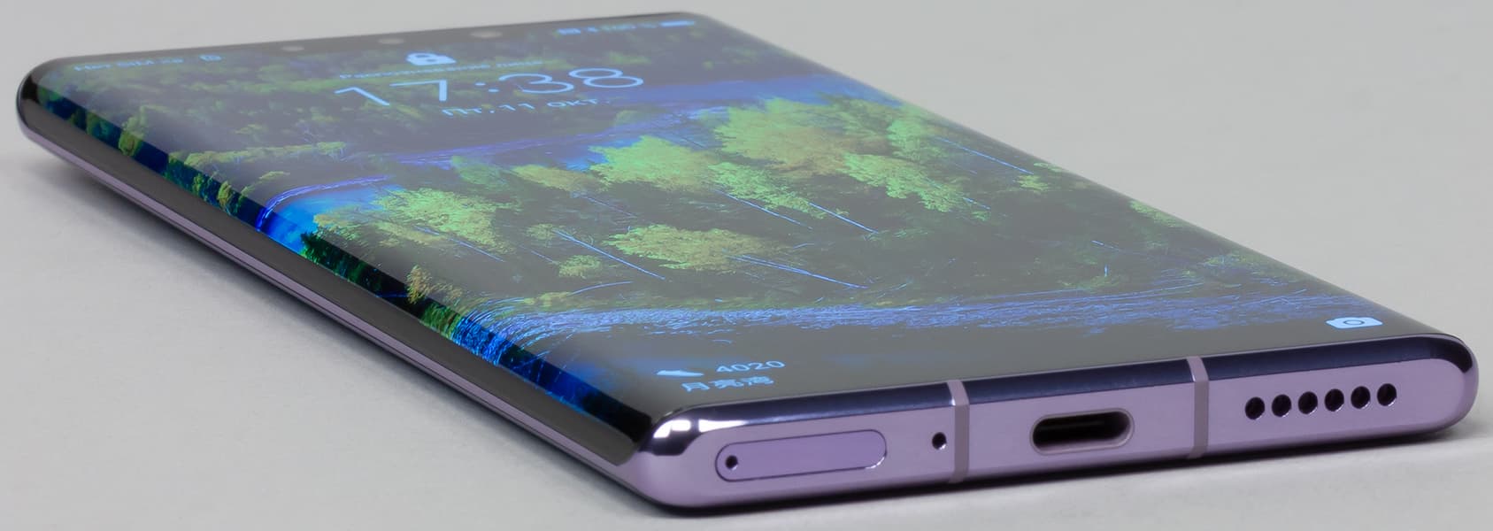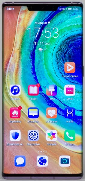 Цветопередача хорошая, цвета в меру насыщенные, цветовой баланс у экранов немного различается. Напомним, что фотография не может служить надежным источником сведений о качестве цветопередачи и приводится только для условной наглядной иллюстрации. В частности, выраженный красноватый оттенок белого и серого полей, присутствующий на фотографиях экрана Huawei Mate 30 Pro, при перпендикулярном взгляде визуально отсутствует, что подтверждается аппаратными тестами с помощью спектрофотометра. Причина в том, что спектральная чувствительность матрицы фотоаппарата неточно совпадает с этой характеристикой человеческого зрения. Заметим, что в данном случае картинка занимает в высоту (при ландшафтной ориентации экрана) всю доступную для вывода изображения область и заходит на загнутые края экрана, что приводит к легкому затемнению и искажению цвета. Также на свету эти области почти всегда бликуют, что еще больше мешает при просмотре изображений, выведенных на весь экран. И даже картинка фильмов с соотношением сторон 16:9 заходит на загибы, что очень не к месту в случае видео.