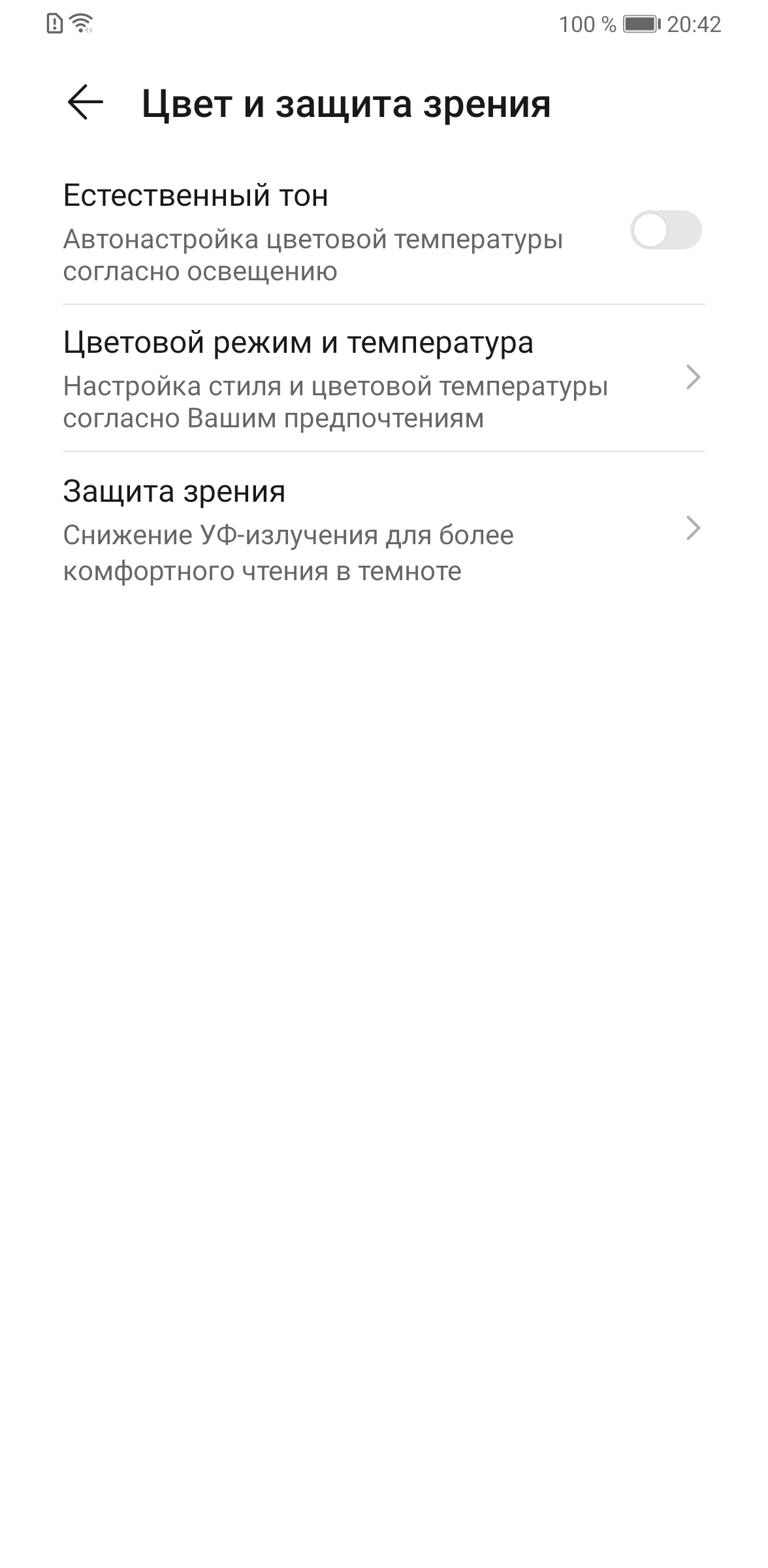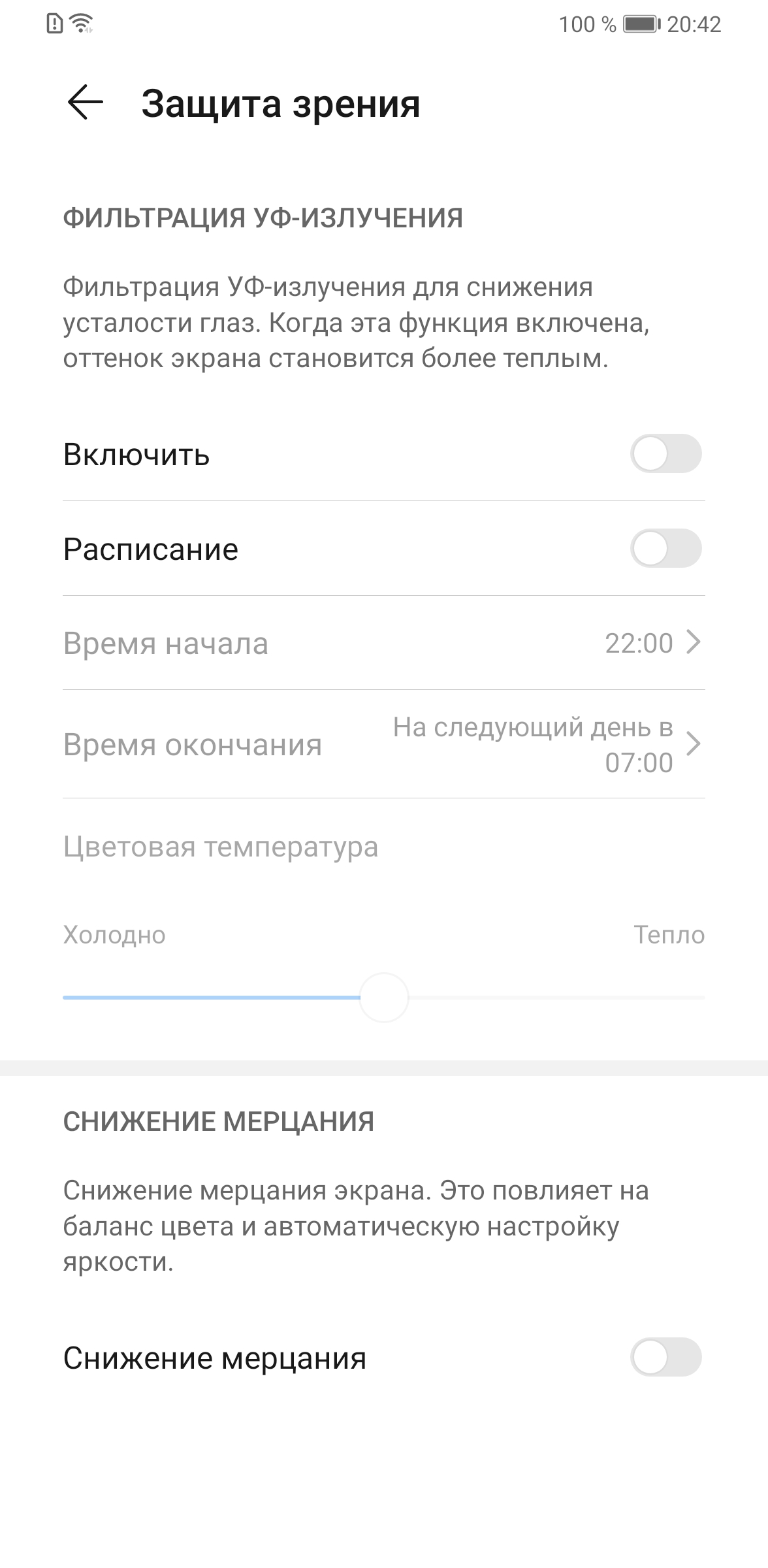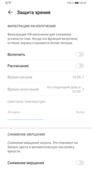 Есть модная нынче функция снижения интенсивности синей компоненты (снимок с экран был выше). В ее описании, конечно, приведен традиционный бред про УФ-излучение и усталость глаз, но такая коррекция, в принципе, может быть полезной, что разъяснено в нашей статье про iPad Pro 9,7″. Однако в любом случае, при развлечении с планшетом или смартфоном на ночь глядя лучше просто снизить яркость экрана до комфортного уровня. Дополнительно желтить экран никакого смысла нет.