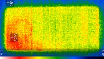 Нагрев больше в верхней правой части аппарата, что, видимо, соответствует расположению микросхемы SoC. По данным теплокамеры, максимальный нагрев составил всего 32 градуса (правда, при температуре окружающего воздуха в 22 градуса), это совсем мало.