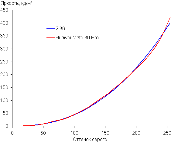 Напомним, что в случае OLED-экранов яркость фрагментов изображения динамично меняется в соответствии с характером выводимого изображения — чуть уменьшается для светлых в целом изображений. В итоге полученная зависимость яркости от оттенка (гамма-кривая), скорее всего, не соответствует гамма-кривой статичного изображения, так как измерения проводились при последовательном выводе оттенков серого почти на весь экран.