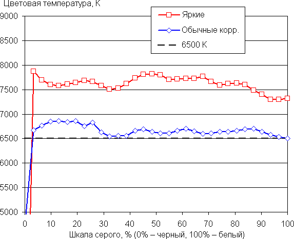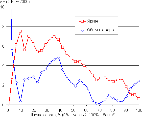 В случае профиля Обычные баланс оттенков на шкале серого хороший, так как на белом поле цветовая температура лишь немного ниже стандартных 6500 К, и отклонение от спектра абсолютно черного тела (ΔE) ниже 3 единиц, что для потребительского устройства считается очень хорошим показателем.