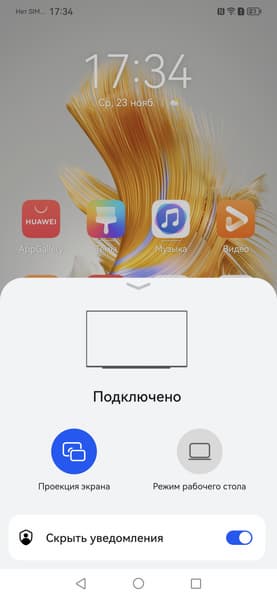 Во втором случае при портретной ориентации экрана смартфона картинка на экране ТВ выводится вписанной по высоте и с широкими черными полями по бокам, а при ландшафтной — вписанной по ширине с узкими черными полями сверху и снизу. Вывода точка в точку в обоих вариантах нет.