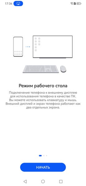 Не все приложения гарантированно могут работать корректно в таком режиме, например в данном случае при выводе окна видеоплеера MX Player во весь экран управляющая панель в нижней части экрана не убиралась, тогда как картинка штатного плеера выводилась правильно. Вывод осуществляется уже в разрешении 1920×1080 один к одному по пикселям. Отметим, что одновременно с выводом изображения и звука можно по USB подключать к смартфону мышь и клавиатуру, USB-флешки и т. д., превращая смартфон в основу для рабочего места, но для этого адаптер или монитор (имеющий вход USB Type-C) должны допускать подключение внешних USB-устройств (то есть иметь USB-концентратор). Поддерживается также подключение к проводной сети на скорости 1 Гбит/с. Для зарядки смартфона к адаптеру/док-станции потребуется подключить зарядное устройство, а мониторы со входом USB Type-C обычно сами подают питание на смартфон. В режиме рабочего стола на внешнем мониторе можно параллельно работать на самом смартфоне, то есть получается два рабочих стола одновременно, но вывод видео в режиме аппаратного декодирования осуществляется только на один экран, также одна и та же программа не может работать и там, и там.