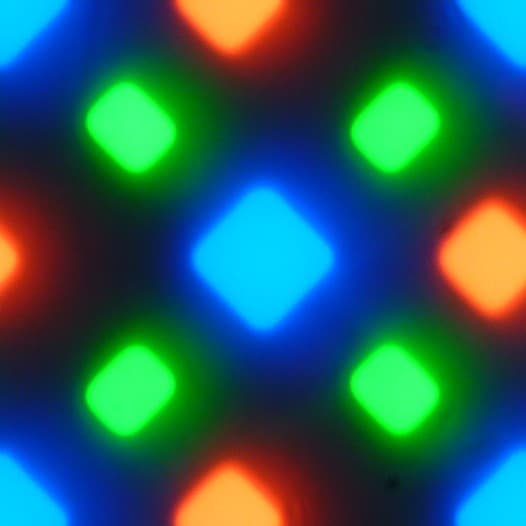 На фрагменте выше можно насчитать 4 зеленых субпикселя, 2 красных (1 целый и 2 половинки) и 2 синих (1 целый и 4 четвертушки), при этом, повторяя эти фрагменты, можно выложить весь экран без разрывов и перехлеста. Для таких матриц компания Samsung ввела наименование PenTile RGBG. Разрешение экрана производитель считает по зеленым субпикселям, по двум другим оно будет ниже. Разумеется, присутствуют некоторая неровность контрастных границ и другие артефакты. Впрочем, из-за очень высокого разрешения они лишь минимально сказываются на качестве изображения.