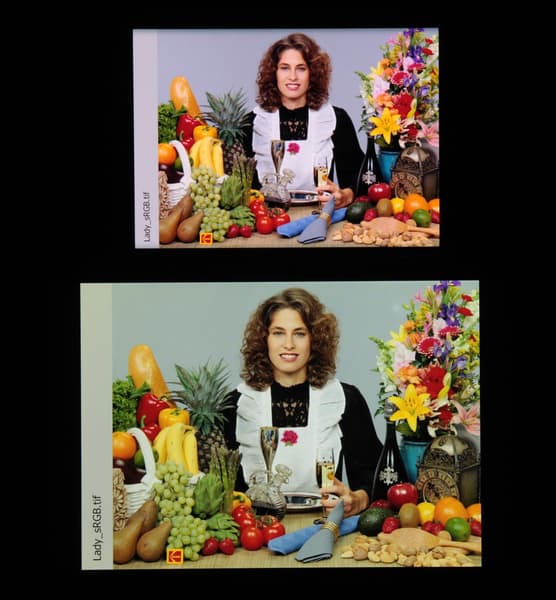 Отметим хорошую равномерность яркости и цветового тона белого поля (за исключением едва видимого затемнения и изменения оттенка к загнутым краям).