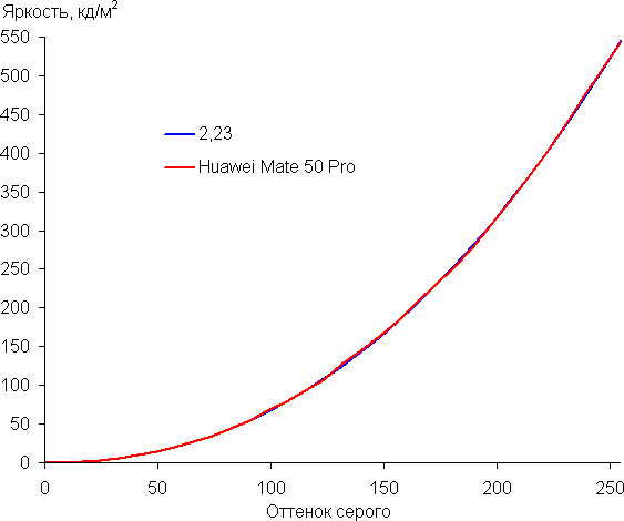 Напомним, что в случае OLED-экранов яркость фрагментов изображения динамично меняется в соответствии с характером выводимого изображения — чуть уменьшается для светлых в целом изображений. В итоге полученная зависимость яркости от оттенка (гамма-кривая), скорее всего, не соответствует гамма-кривой статичного изображения, так как измерения проводились при последовательном выводе оттенков серого почти на весь экран.
