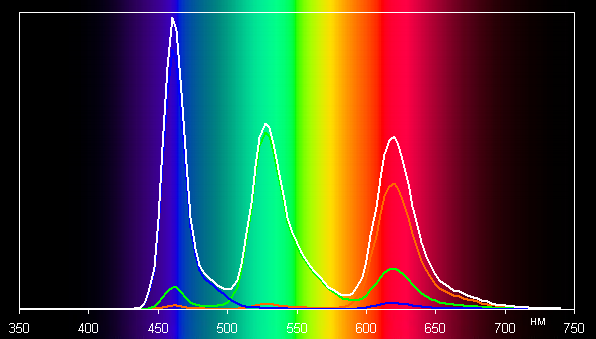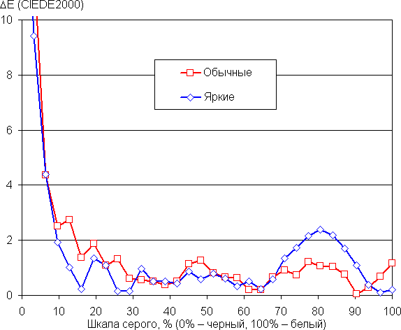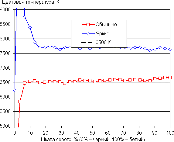 В этом устройстве есть возможность скорректировать цветовой баланс с помощью выбора профиля цветовой температуры или регулировки оттенка на цветовом круге. Впрочем, в случае профиля Обычные цвета даже без коррекции баланс оттенков на шкале серого отличный, так как цветовая температура очень близка к стандартным 6500 К, и отклонение от спектра абсолютно черного тела (ΔE) ниже 3 единиц, что даже для профессионального устройства считается хорошим показателем. При этом цветовая температура и ΔE мало изменяются от оттенка к оттенку — это положительно сказывается на визуальной оценке цветового баланса. (Самые темные области шкалы серого можно не учитывать, так как там баланс цветов не имеет большого значения, да и погрешность измерений цветовых характеристик на низкой яркости большая.)