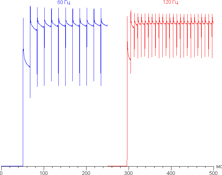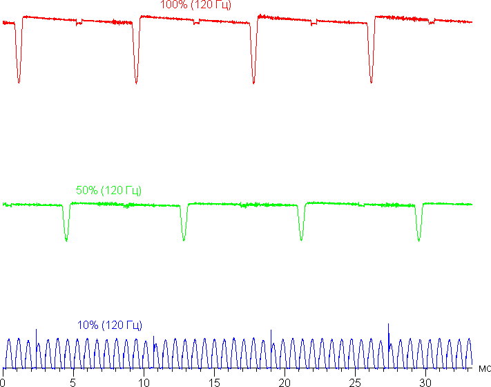 Видно, что на высокой и средней яркости частота модуляции увеличилась в 2 раза, а на низкой яркости характер модуляции принципиально не изменился.