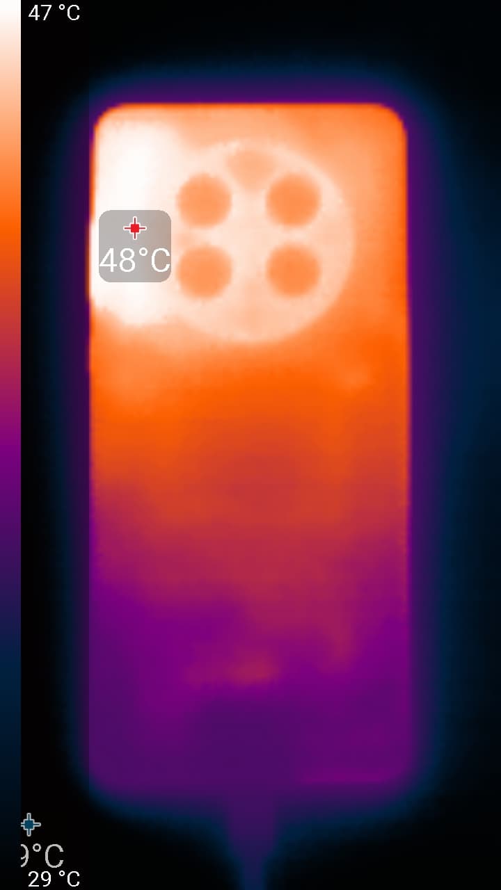 Нагрев больше в верхней правой части аппарата, что, видимо, соответствует расположению микросхемы SoC. По данным теплокамеры, максимальный нагрев составил 48 градусов (при температуре окружающего воздуха в 24 градуса), это не самый высокий нагрев для данного теста в сравнении с другими современными производительными смартфонами. Умеренный нагрев явно обусловлен сильным снижением производительности под нагрузкой (тротлингом).