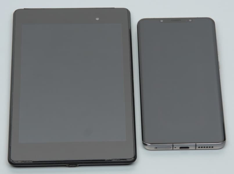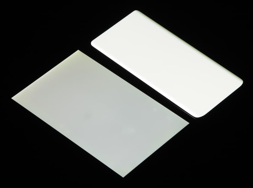 Лицевая поверхность экрана выполнена в виде стеклянной пластины с зеркально-гладкой поверхностью, устойчивой к появлению царапин. Судя по отражению объектов, антибликовые свойства экрана лучше, чем у экрана Google Nexus 7 (2013) (далее просто Nexus 7). Для наглядности приведем фотографию, на которой в выключенных экранах отражается белая поверхность (слева — Nexus 7, справа — Huawei Mate 50 Pro, далее их можно различать по размеру):