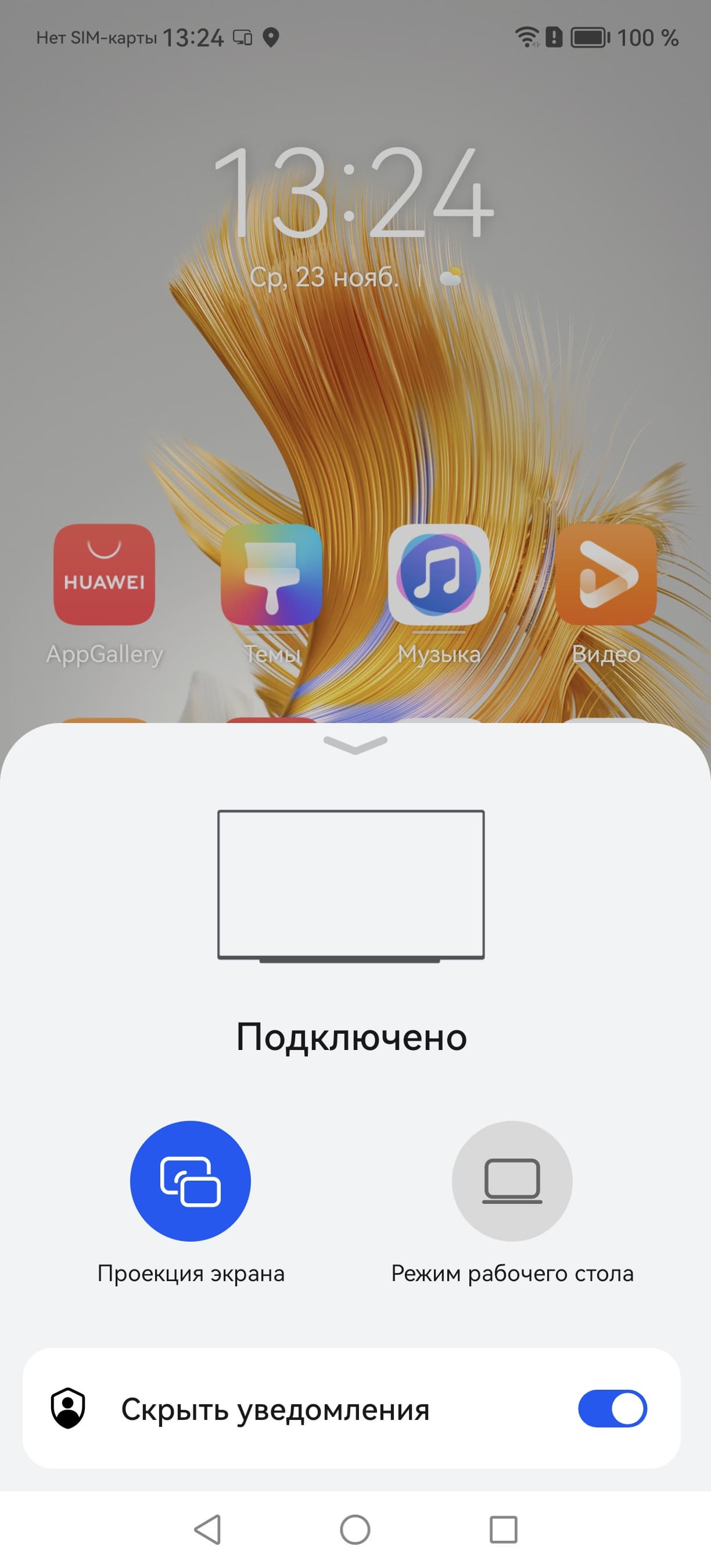 В отличие от Huawei Mate 50 Pro, здесь нет 3D-сканера лица, а потому в темноте без подсветки авторизация по лицу происходить не будет. Шторка уведомлений разбита на две части в зависимости от угла вытягивания. Возможности у интерфейса весьма широкие, а учитывая серьезный подход к разработке собственной экосистемы «Суперустройство», смартфон при подключении к монитору вообще может превращаться в мини-компьютер с возможностью присоединения внешних клавиатуры с мышью.
