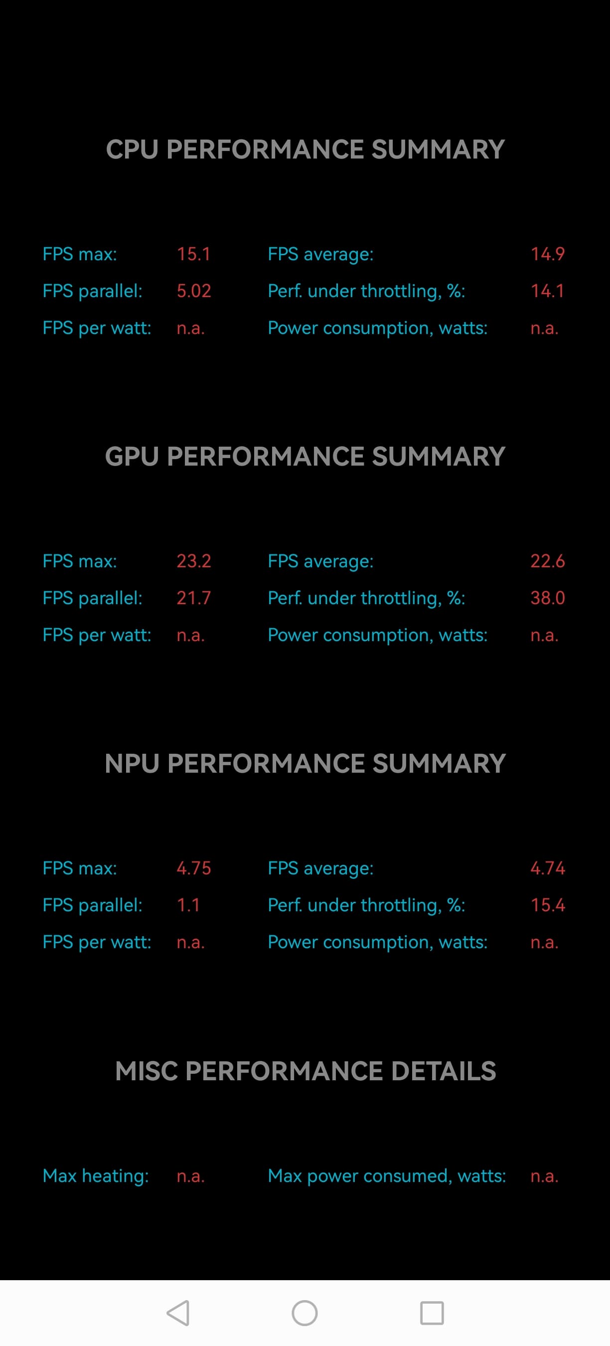 Нагрев больше в верхней правой части аппарата, что, видимо, соответствует расположению микросхемы SoC. По данным теплокамеры, максимальный нагрев составил 46 градусов (при температуре окружающего воздуха в 24 градуса), это невысокий нагрев в случае данного теста в сравнении с другими современными производительными смартфонами. Умеренный нагрев явно обусловлен сильным снижением производительности.