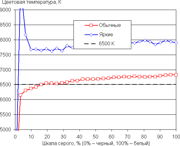 В этом устройстве есть возможность скорректировать цветовой баланс с помощью выбора профиля цветовой температуры или регулировки оттенка на цветовом круге. Впрочем, в случае профиля Обычные цвета даже без коррекции баланс оттенков на шкале серого хороший, так как цветовая температура близка к стандартным 6500 К, и отклонение от спектра абсолютно черного тела (ΔE) ниже 10 единиц, что для потребительского устройства считается приемлемым показателем. При этом цветовая температура и ΔE мало изменяются от оттенка к оттенку — это положительно сказывается на визуальной оценке цветового баланса. (Самые темные области шкалы серого можно не учитывать, так как там баланс цветов не имеет большого значения, да и погрешность измерений цветовых характеристик на низкой яркости большая.)