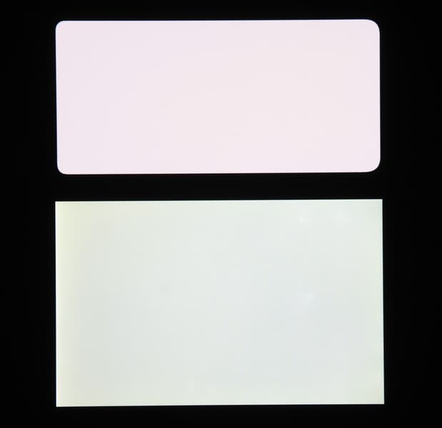 Экран характеризуется великолепными углами обзора. Правда, белый цвет при отклонении на большие углы приобретает едва заметный сине-зеленый оттенок. Черный цвет остается просто черным под любыми углами. Он настолько черный, что параметр контрастности в данном случае неприменим. Для сравнения приведем фотографии, на которых на экраны Huawei Mate 50 и второго участника сравнения выведены одинаковые изображения, при этом яркость экранов изначально установлена примерно на 200 кд/м², а цветовой баланс на фотоаппарате принудительно переключен на 6500 К.