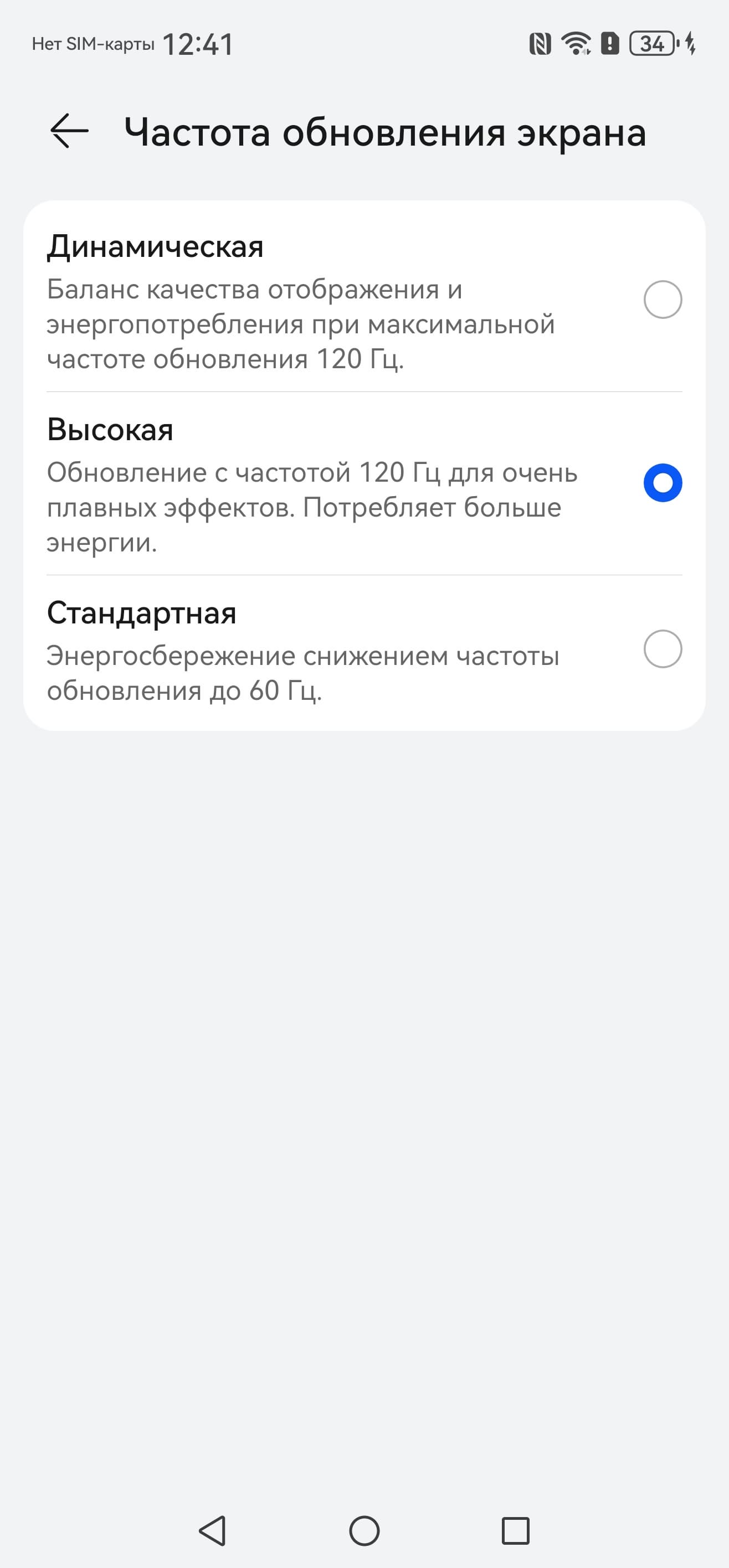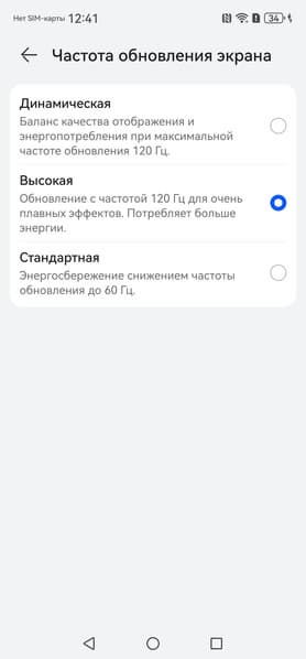 В этом режиме плавность прокрутки (списков в меню и т. д.) повышается. Характер модуляции при этом не меняется. По факту режим всегда динамичный и на статичных изображениях, и если не касаться экрана, то частота обновления может снижаться до 1 Гц. Данной настройкой пользователь ограничивает только максимальную частоту обновления.