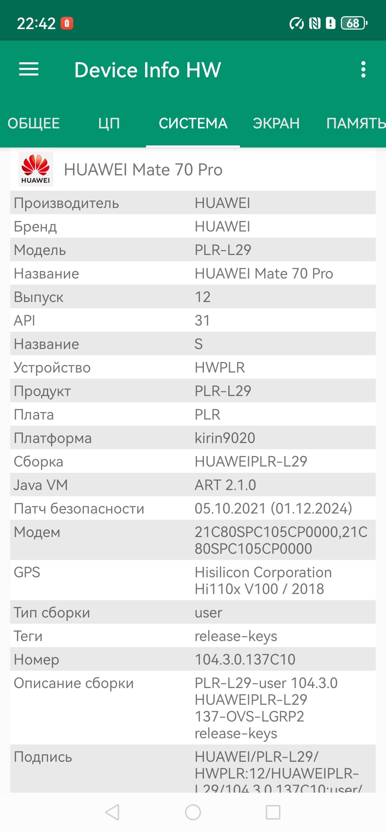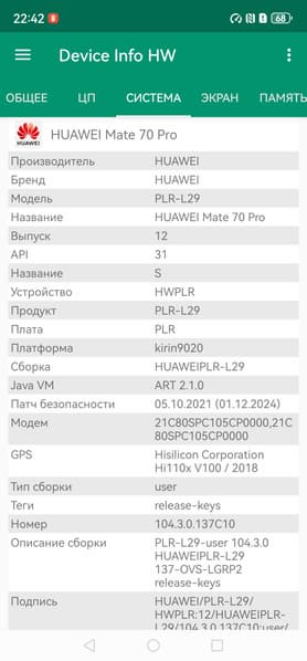 Основные характеристики Huawei Mate 70 Pro (модель PLR-L29)