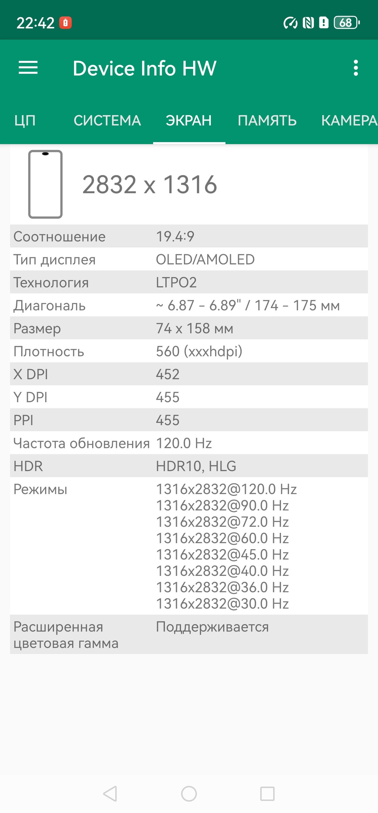 - Сенсорный дисплей AMOLED, 6,9″, 1316×2832, 19.5:9, 453 ppi, 120 Гц