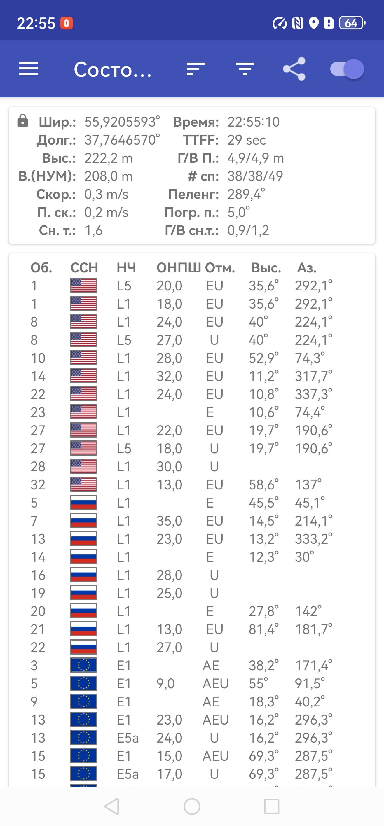 - GPS (L1+L5), Глонасс (L1), BDS (B1I+B1c+B2a+B2b), Galileo (E1+E5a+E5b), QZSS (L1+L5), NavIC