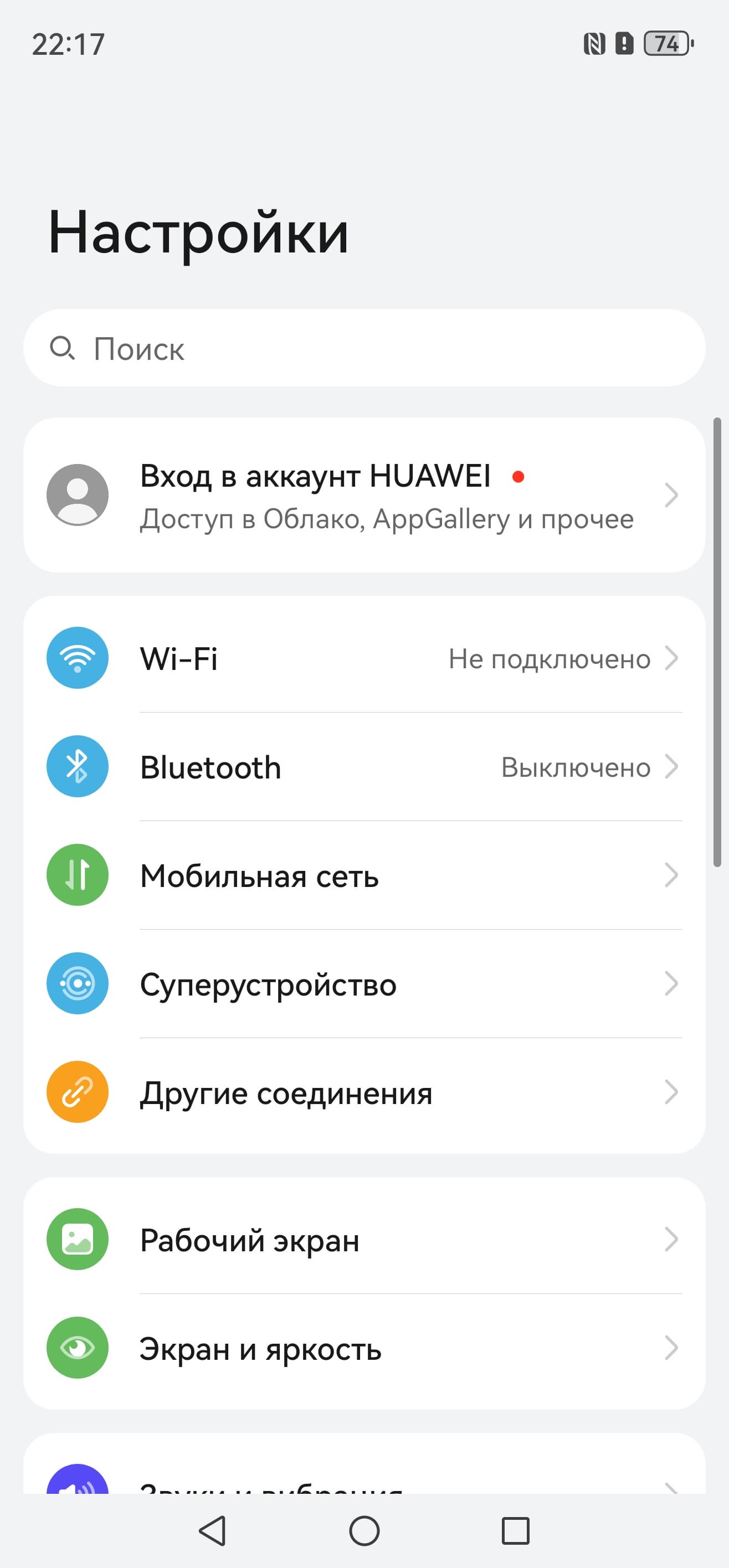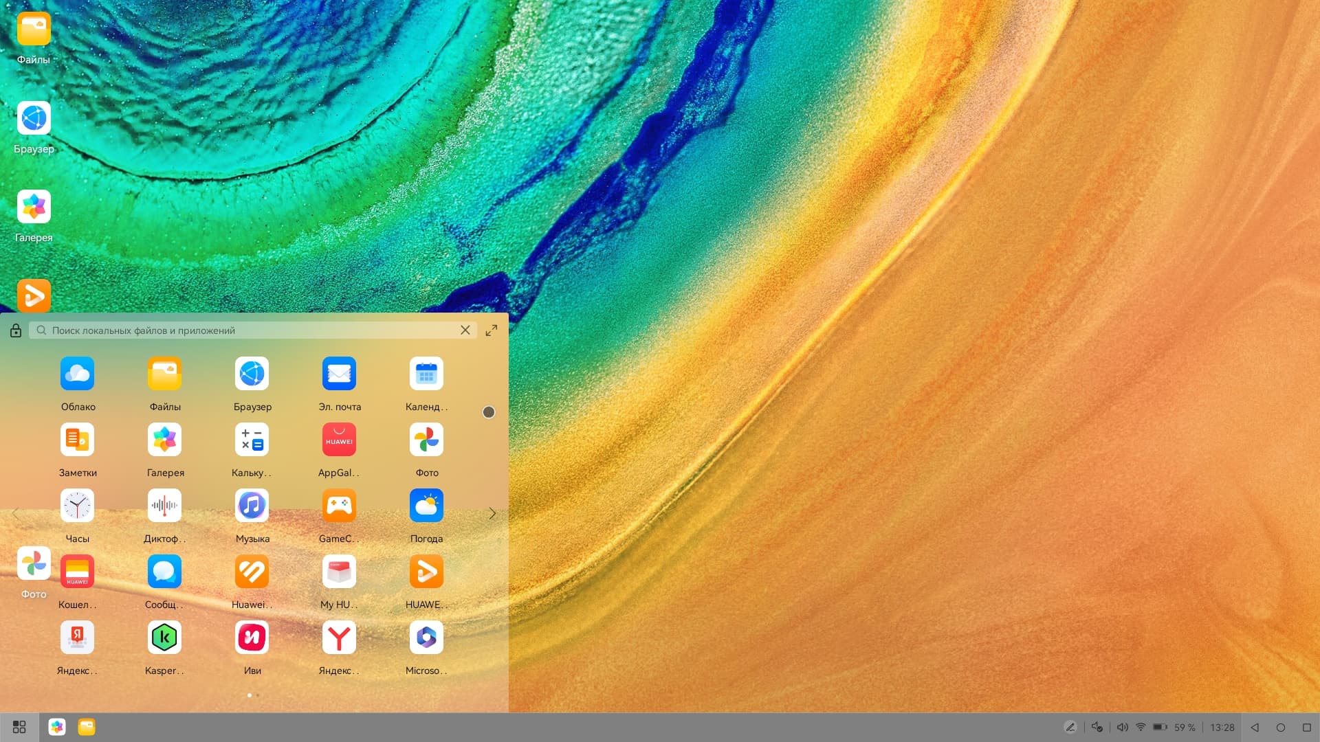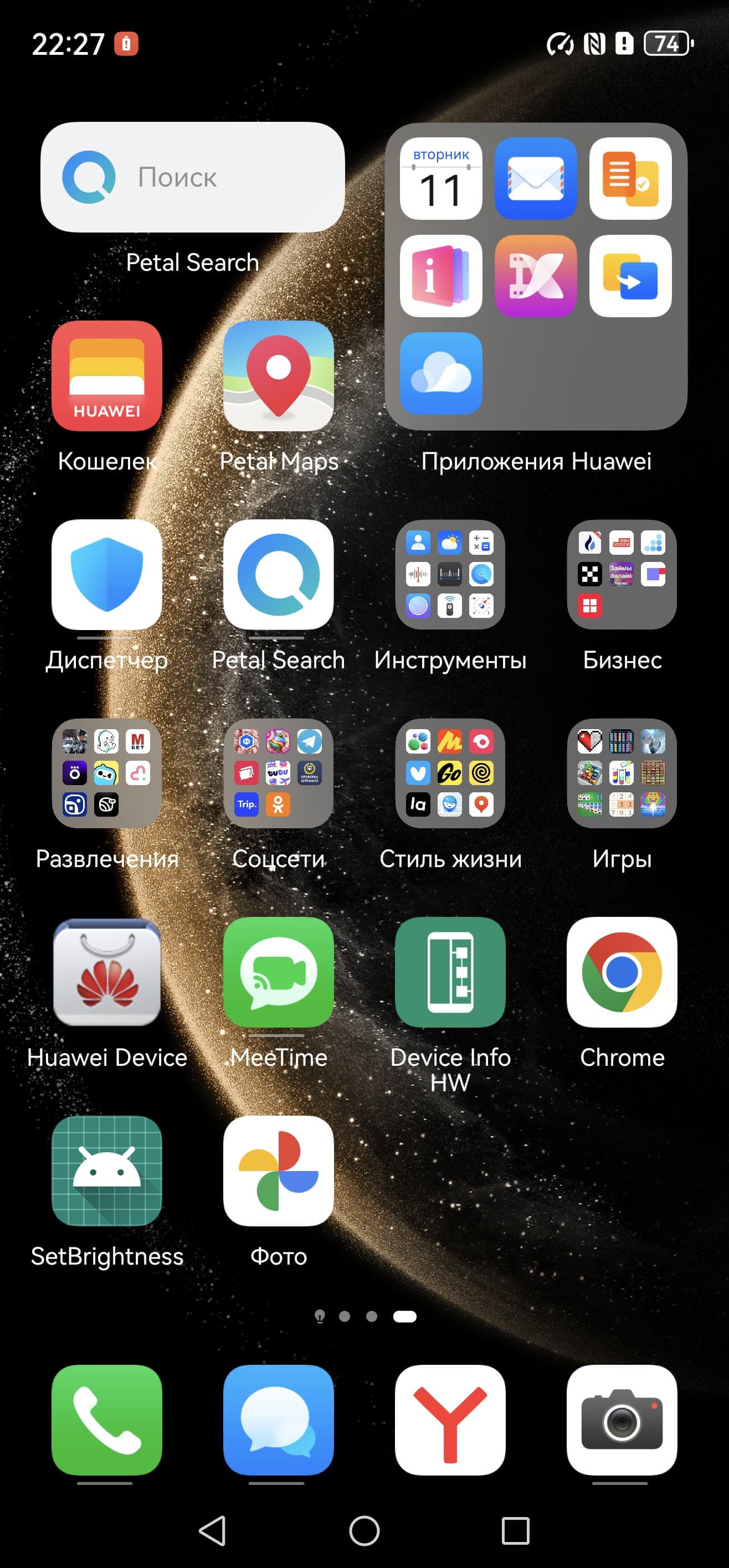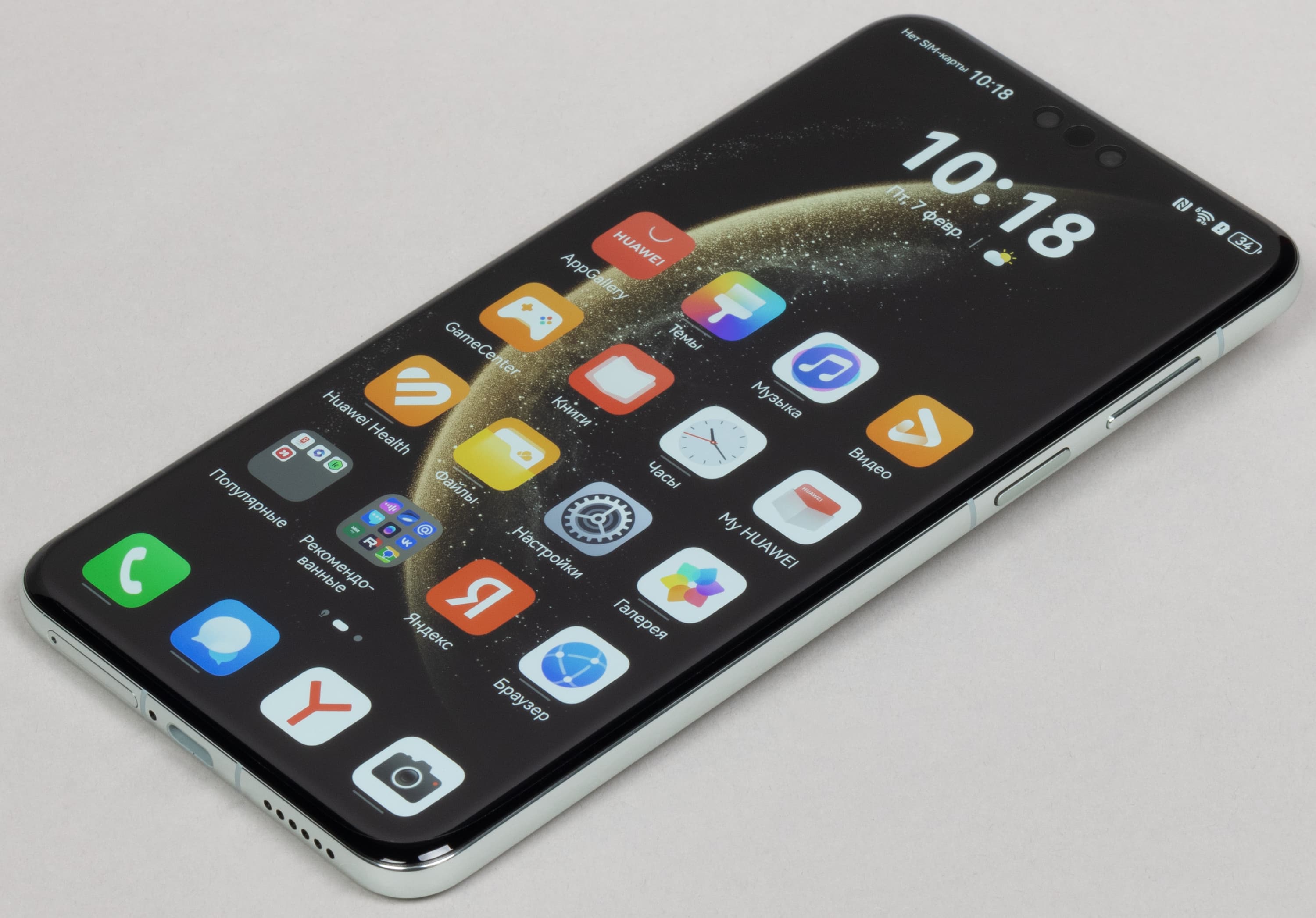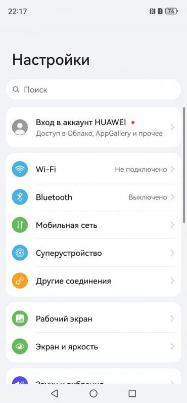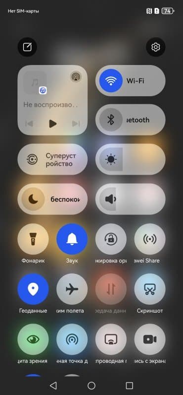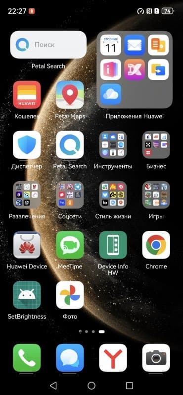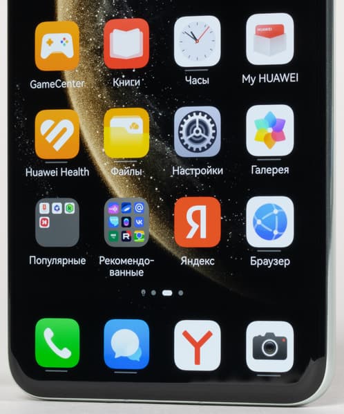 Оттягиваемая шторка здесь разделена на две части. Официальный магазин приложений Google Play и доступ к сервисам Google привычно отсутствуют, вместо них используются собственные сервисы — магазин приложений AppGallery и многофункциональный поисковый сервис Petal. Рекламы нет. Дополнительных приложений предустановлено чрезвычайно много.