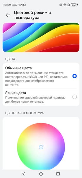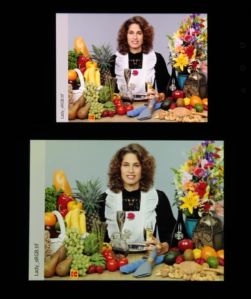 Отметим, что на экранах с уширенным цветовым охватом (без соответствующей коррекции) цвета́ обычных изображений, оптимизированных для устройств sRGB, выглядят неестественно насыщенными. Отсюда и рекомендация: в большинстве случаев смотреть кино, фотографии и все естественное лучше при выборе профиля Обычные цвета. При этом, если в изображении прописан отличный от sRGB профиль, то смотреть его лучше с использованием штатной программы Галерея.