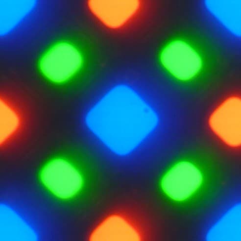 В этом экране используется матрица AMOLED — активная матрица на органических светодиодах. Полноцветное изображение создается с помощью субпикселей трех цветов — красного (R), зеленого (G) и синего (B), но красных и синих субпикселей в два раза меньше, что можно обозначить как RGBG. Это подтверждается фрагментом микрофотографии: