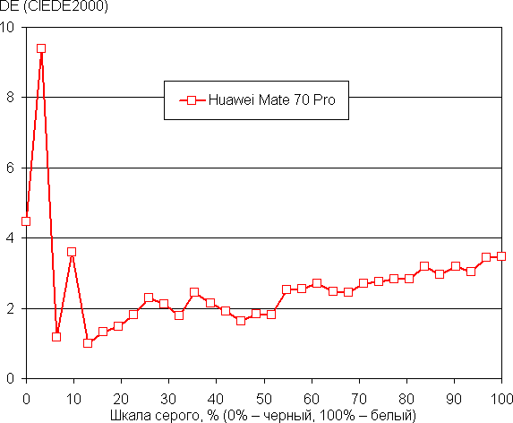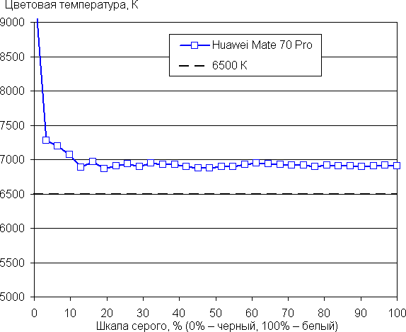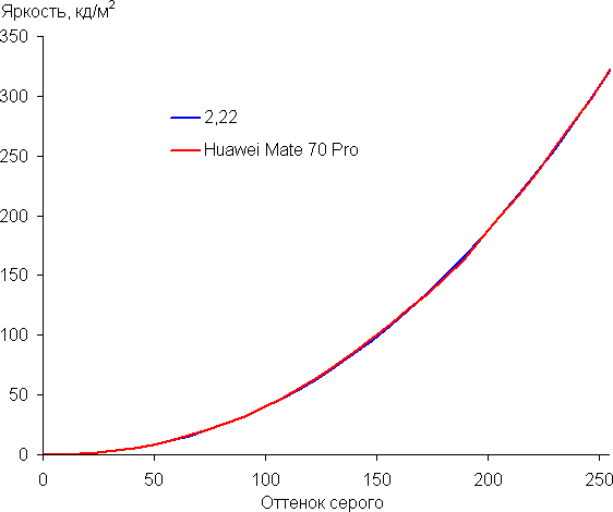 Напомним, что в случае OLED-экранов яркость фрагментов изображения динамично меняется в соответствии с характером выводимого изображения — чуть уменьшается для светлых в целом изображений. В итоге полученная зависимость яркости от оттенка (гамма-кривая), скорее всего, не соответствует гамма-кривой статичного изображения, так как измерения проводились при последовательном выводе оттенков серого почти на весь экран.