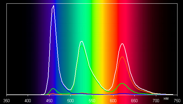В первом случае спектры компонент (то есть спектры чистых красного, зеленого и синего цветов) очень хорошо разделены: