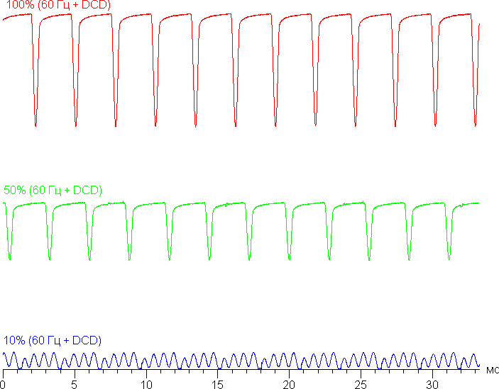 В англоязычной литературе и в новостях обычно используют название DC Dimming (на графиках сократим до DCD). При включении этой функции меняется только характер модуляции на низкой яркости. Видимого мерцания как не было, так и нет. Приведем графики: