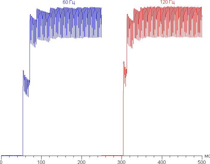 Переключение состояния элементов матрицы выполняется практически мгновенно, но на фронте включения может присутствовать ступенька шириной примерно 17 мс (что соответствует частоте обновления экрана примерно в 60 Гц) или примерно 8 мс (120 Гц). Например, так выглядит зависимость яркости от времени при переходе от черного к белому: