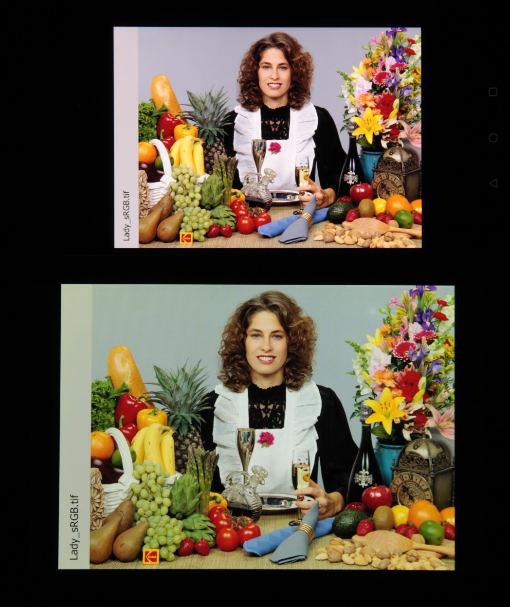 Цветопередача хорошая, цвета в меру насыщенные, цветовой баланс у экранов немного различается. Напомним, что фотография не может служить надежным источником сведений о качестве цветопередачи и приводится только для условной наглядной иллюстрации. В частности, выраженный красноватый оттенок белого и серого полей, присутствующий на фотографиях экрана смартфона, при перпендикулярном взгляде визуально отсутствует, что подтверждается аппаратными тестами с помощью спектрофотометра. Причина в том, что спектральная чувствительность матрицы фотоаппарата неточно совпадает с этой характеристикой человеческого зрения.